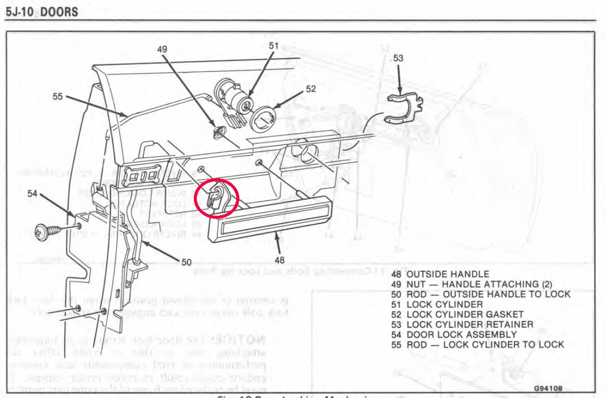 That clip attaches the rod for the latch to the outside door handle. I had to put it into the door handle first, then snap the rod into it (took some real creative vocabulary to get it together). Ogre is right about Dorman; I bought a assortment of about 8 clips that included them. I'm not sure whether you can buy just the ones you need separately. Also, on my '88 GT at least, the ones for the right and left doors were not the same. They are mirror images of each other.