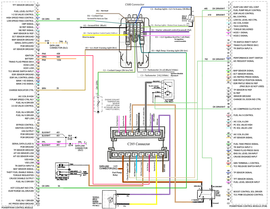 Ok, I got the car to crank. It seems when someone switched over from the original manual trans in the car to an automatic instead of moving the pin in the C500 to A4 for the wire running to the neutral switch they just reconfigured the wires closer to the neutral switch. My problem now is that the car won`t start. Per this diagram there is suppose to be a Pink wire running from the C500 to the ICM for a 12V feed. My harness, which is an Ignition Technologies, does not have a Pink wire in the harness from the C500 It does have these two small circuit boards (one which is fried) in the vicinity of the C203 plug. They are labelled vats. On other social media sites nobody seems to know what the small circuit boards are, leading me to believe that nowadays most people just program the vats off in the computer and maybe those circuit boards aren`t necessary. And, since there seems to be no 12V feed wire for the ICM in the C500 harness it must originate from somewhere else. I just need to get 12V to the ICM somehow and was looking for ideas. Thanks