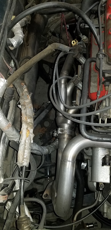 With the stock headers, the bundle of wires from the ECU just floated next to the firewall, and did not come close to the header pipes, since there was a large gap between the Y bend and the front header.