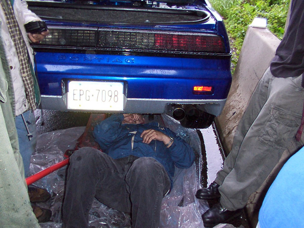 We had quite a large crew assembled that rainy morning. I was driving the Blue Demon, Jnco had his red car, my friend Tim was driving Dad’s car so Dad and Mom could take the truck and trailer (in case of emergency), Ken had come in from Pittsburgh with his red coupe, Flea had his car and Jamie and Joe had her 86GT. We drove up to the gas station and when I went to restart my car I had a dead bat- tery! Not a good way to start the morning! We quickly remedied the issue and set off down Route 12. As many good things go wrong quick, luck was definitely not on our side! I had made it about 3 miles down Route 12 when all of a sudden my battery light came on and my car shut off! I pulled off the road under the Fifth Street underpass and parked the car, since it was pouring rain and I didn't want anyone working on it to get wet. Everyone else pulled over in suit and it was quickly determined that I had lost an alternator belt! Not good!