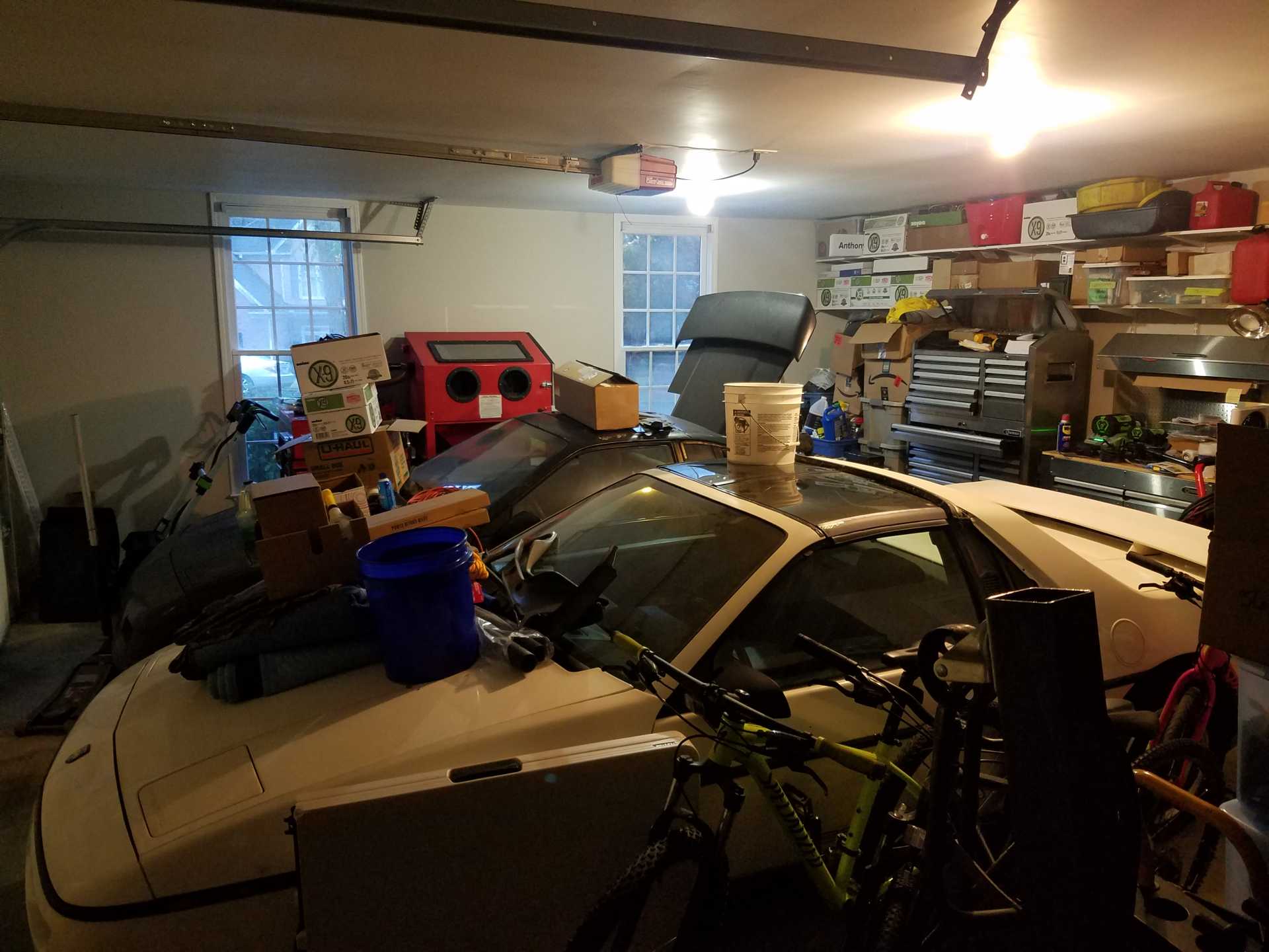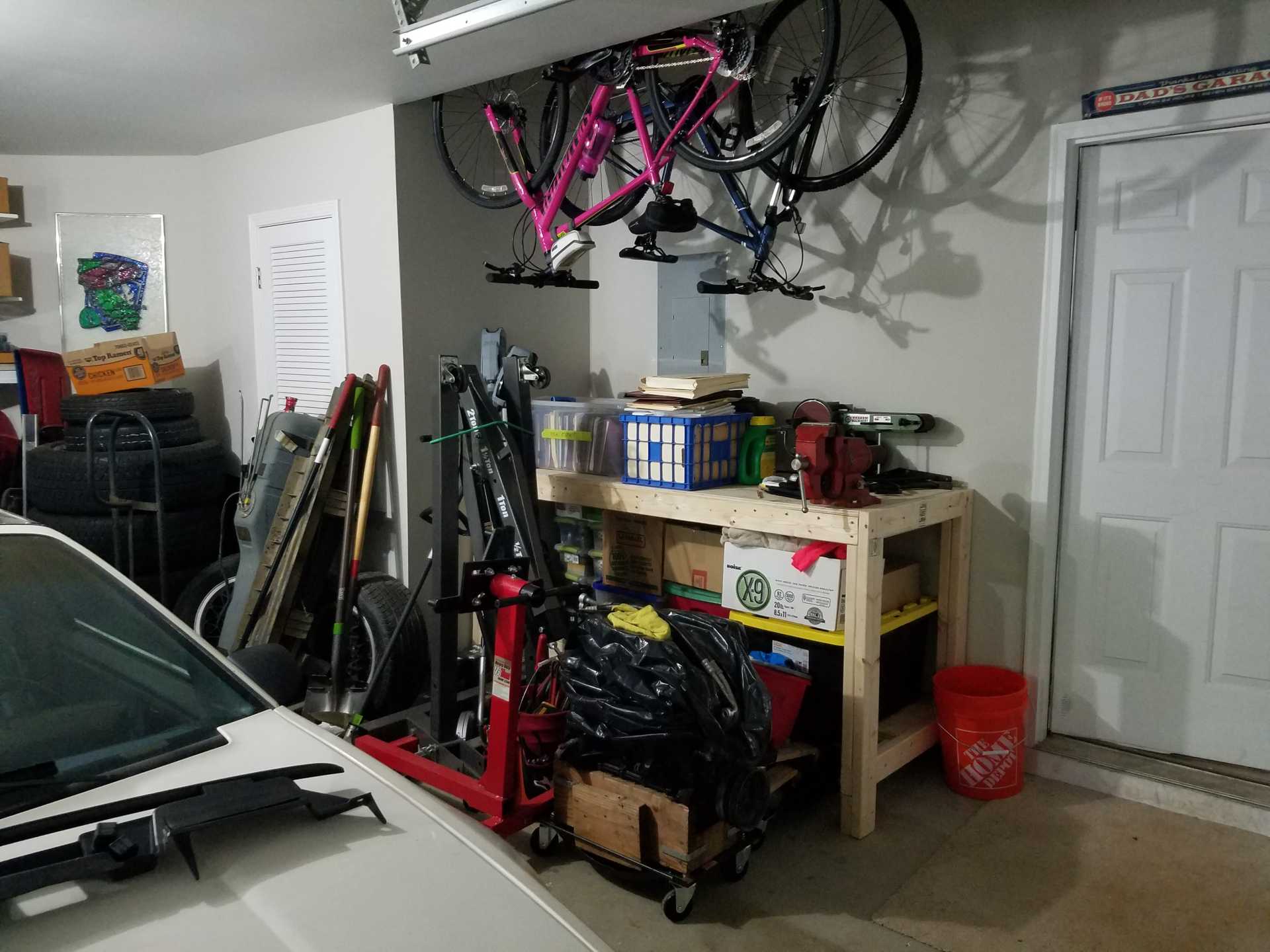 I finally got the time to build a work bench, shelves, and bike racks. I can actually get to the car now!