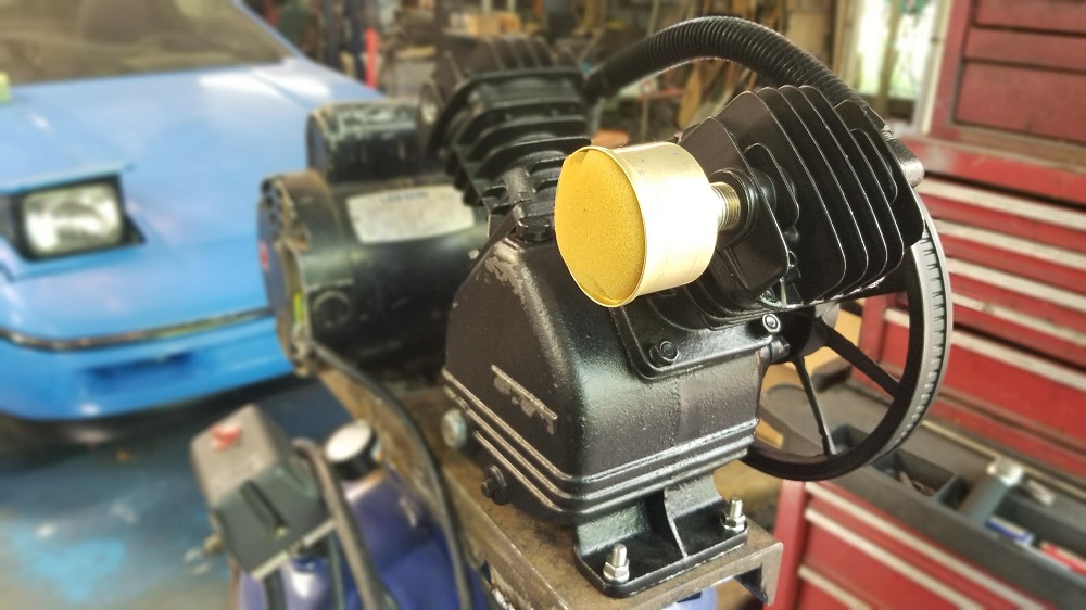 Since the replacement pump came with no air filters, I had to get creative. I welded a big washer to a short section of threaded pipe, then riveted a cat food can to the washer and used a punch to open up the center hole. The filter material is foam rubber cut from an old seat cushion.