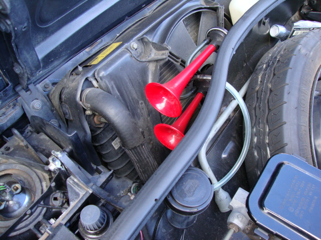 Off-topic but related, here's the horn set-up on my 88GT. I would have done it with the Mera, but it already has loud air horns mounted below. I bought them at the local Checker Auto store. Pretty simple wiring, one wire is just grounded to the chassis, and the other wire I tied in to the existing wire in that big loom there on the front left fender. Don't have to worry about a relay, since that it located further North of where I tied into the horn wire. So basically I have two air horns (one is high pitched and one is low), AND the single 88 horn is still wired. It's the perfect setup, seriously, REALLY loud. I consider it paid for itself...used it probably 3-4 times to get other people's attention when they were cutting in front of me (one was a semi that I attempted to overtake on the right).
