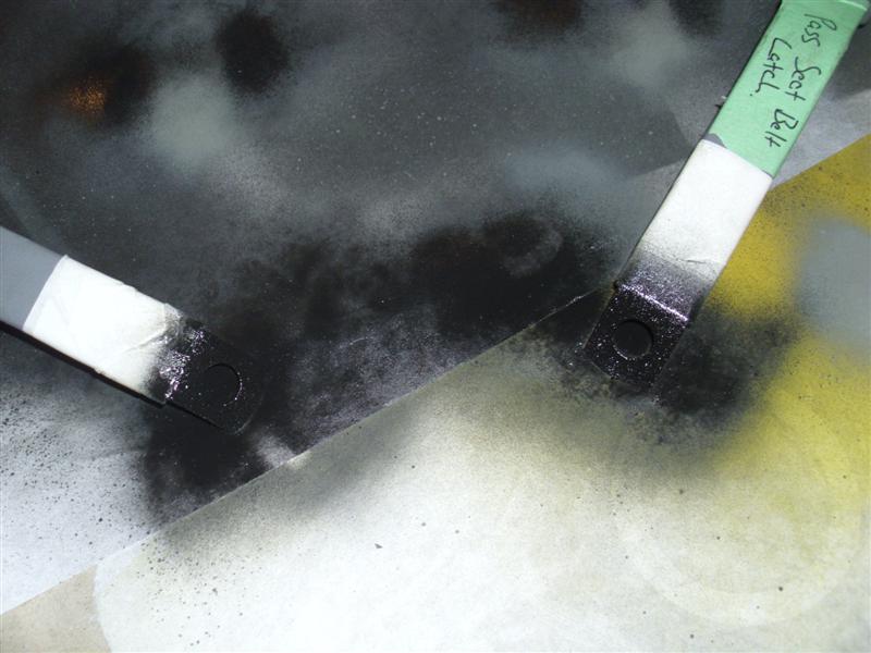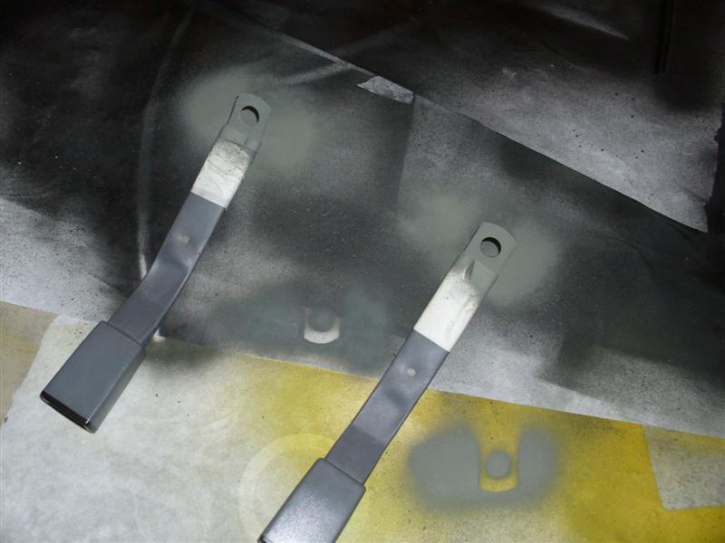 Kathryn cleaned up the anchor belts for the seatbelts, they were a bit rusted down by the attachment points. The vinyl will still need dyed etc. but at least they are on the way. Kathryn cleaned them up with the wire wheel then primed than and got the first coat of paint on the anchor points.