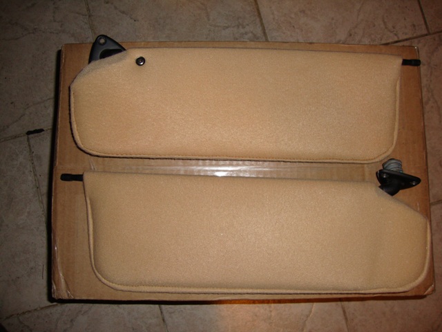 I put them on a brown box so you can see the color contrast. NOT beechwood...more like tan. Also, that pivot mechanism (pin/sleeve) is in absolutely great condition. No need to over-tighten the adjustment screw on the visor, they stay up fine. I ensured that when these were re-done, that FieroThomas used the cores that I sent him from my Mera (with 28K miles).