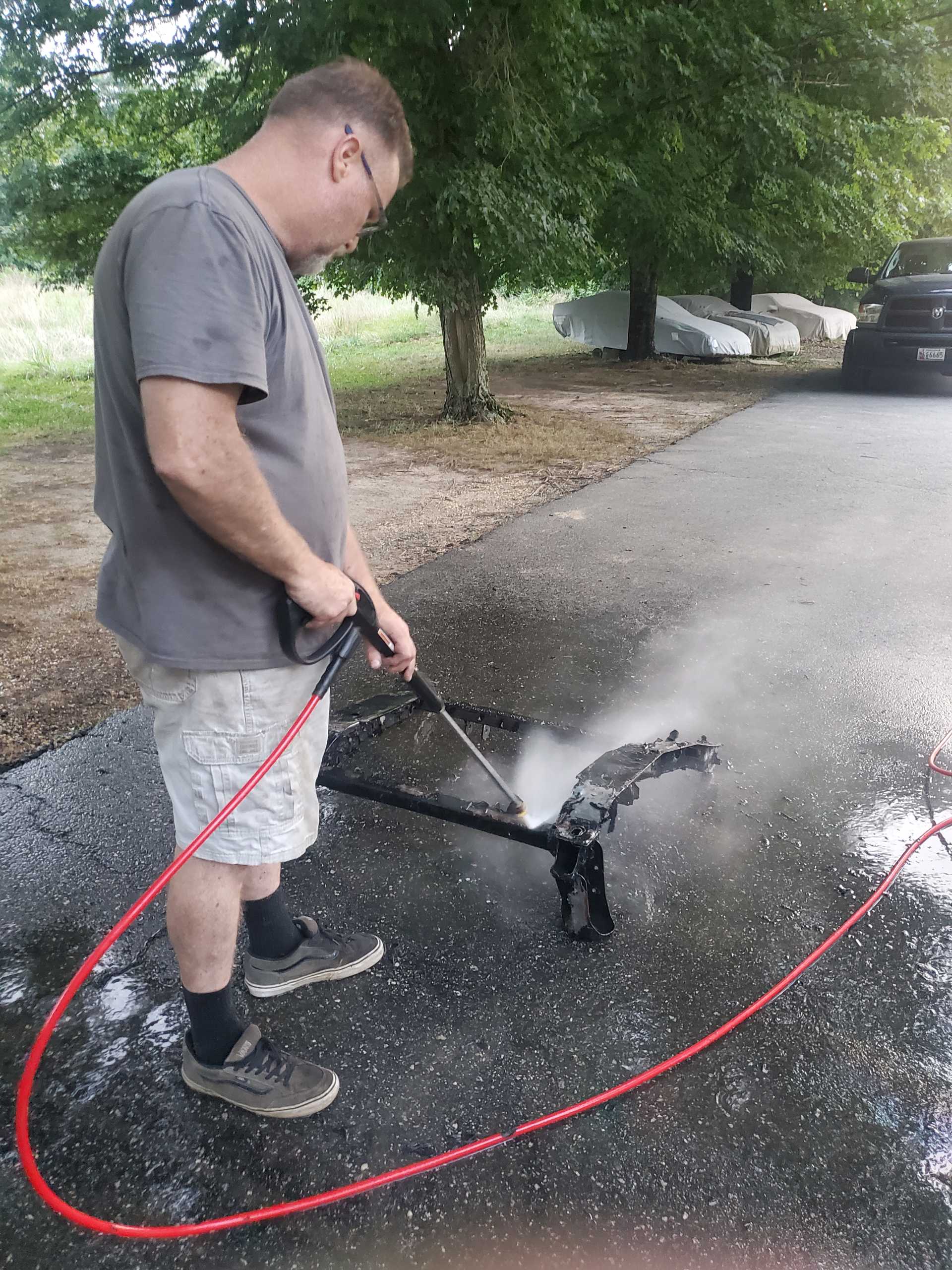 While we waited to move forward, we set about working on the cradle. It became a family effort - first trying Payten's soda blaster before turning to Jenn's paint stripper. While the smell was atrocious, between the stripper and Gary's power washer, we made progress to be ready for POR-15 application the next AM.