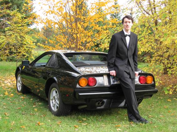 Yes, Jeff was sitting on the back of the Mera when the picture was taken, but it is not jacked up at all in the rear. The Goodyear tires are p255r60/15 in the back and p235r60/15 front. If my memory serves, the height difference between the two sizes is somewhere around 1 1/2 inches. For an idea of scale, Jeff is 4'30" tall (ahhhh...that's 6'6") .... the same height as me. We both fit into our respective Fieros with headroom to spare!
