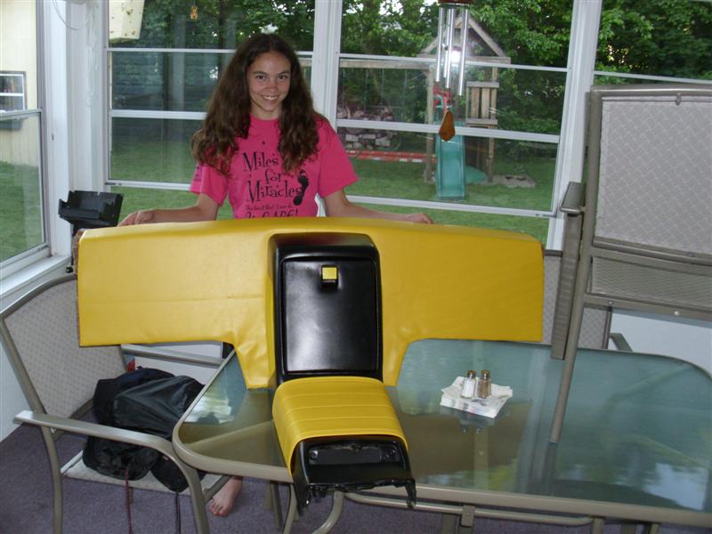 That was a bit trickier. You really need to stretch the cover to get it tight and get out the wrinkles. Kathryn did a pretty good job and Dad helped, but still not sure that we did as good as we could. This might get redone yet again...We'll see. Of course once she got that far she was curious to see what it would look like mocked up with the console and the firewall and then with the console, firewall and the seats.