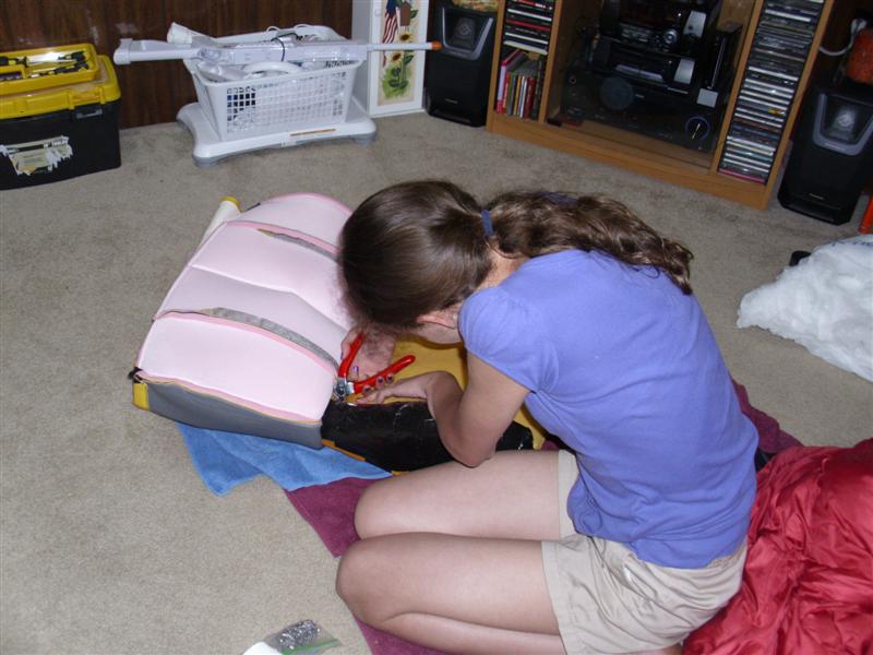 Then you have to turn the seat covers inside out so that you can install them. Here Kathryn is doing the turning....