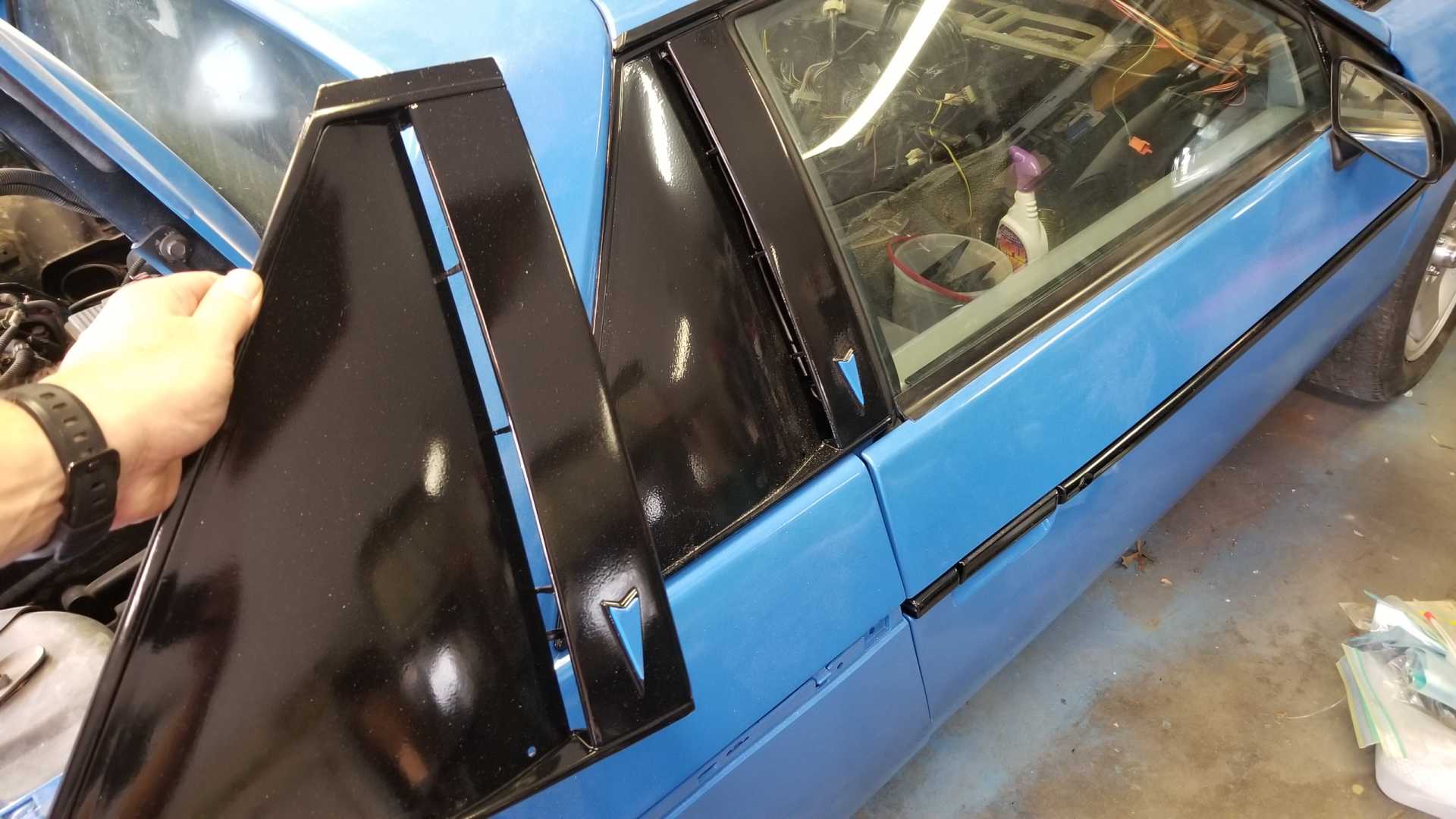 I sanded and painted one of my sets of sail panels, but the left one had some kind of contamination on it and the paint kept bubbling up. I finally gave up on it and grabbed one of my other spares (I have four sets). I then spent several days sanding and painting it, and then installed my other homemade blue Pontiac logo, only to realize I’d grabbed a right hand one instead of a left hand one.