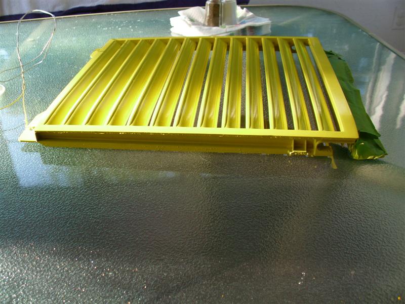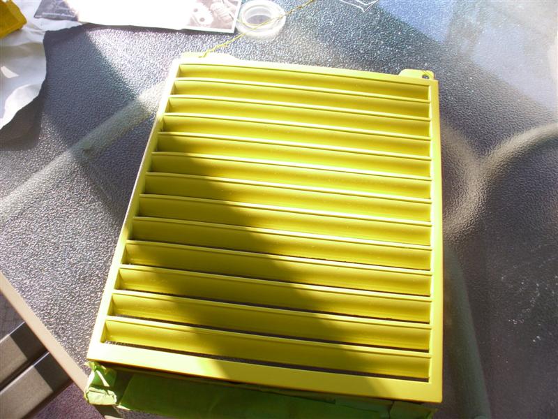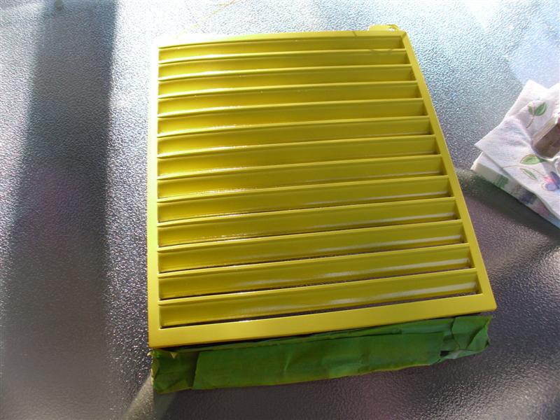last i have been working on the back vents; first to try and get the paint off of them i tried.... first paint stripping them but the paint obviously refused to come unstuck second i tried sanding by hand yet of course i could get all the way down between the slats so that was a fail third i simply sand blasted them much much easier i tell you if anyone gives you the choice take the blaster! after blasting them i just scrubbed away all the sand, dust, and other stuff that was left behind then dad and i powder coated it yellow. here's the pics