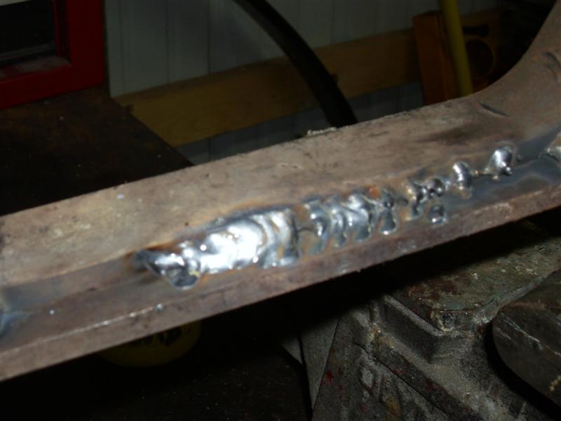 Welding is an art. With the start you have it looks like you could become a very good welder. By art, I mean you cannot read a book to become a good welder it takes an inate skill combined with practice. Keep practicing and you will do quite well. As you get more used to the welder and the arcs that it generates you will appreciate what it can do for you. One caution is to make sure you are well covered so that your skin is not exposed. Somehow the little weld sputters find their way onto your skin if you don't take care and the light from the welding arcs can give your skin a serious burn similar to a bad sun burn. Of course make sure your eyes are always protected. I am sure that your dad has taken all of these precautions, but it probably wouldn't hurt to hear those cautions reinforced by someone else.
