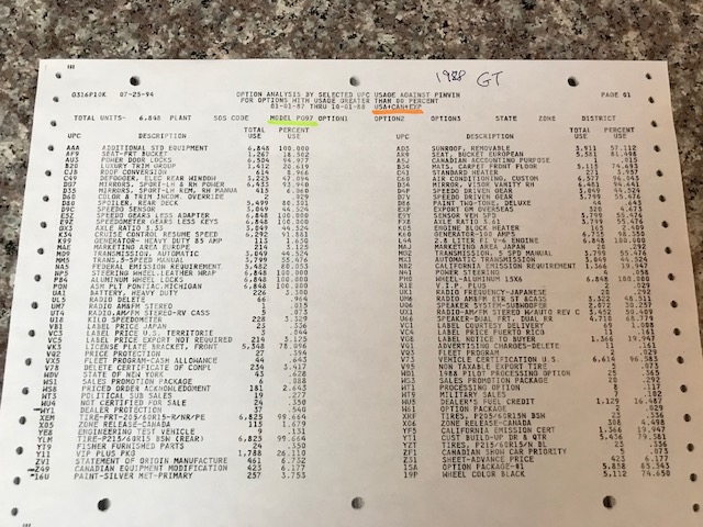 The 1987 Fiero UPC (RPO) report should look like this 1988 report....