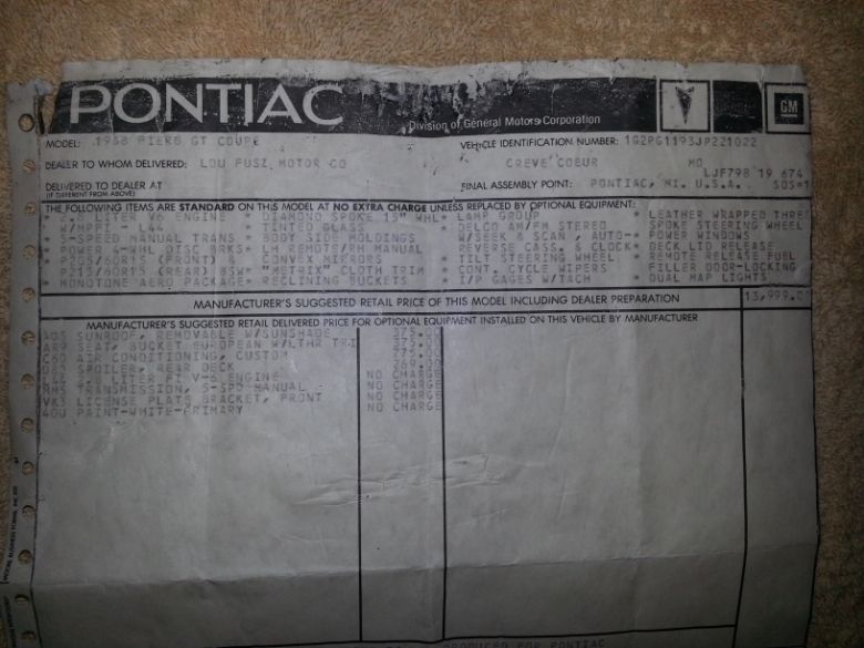 VIN: 1G2PG1198JP204880 Year: 1988 Type: GT Exterior: Red Wheels: Black lace Interior: Beechwood Seats: Leather (stock) Options: Leather seats, spoiler (not on car), automatic transmission, PW, PM, PDL, map pockets, Engine: 2.8L Transmission: Automatic Location: Garden City, MI Mileage: 121,000 Condition: Decent. Has a broken taillight and body damage. Status: For sale on Detroit Craigslist for $2900 PFF Member: None http://detroit.craigslist.o.../cto/4599981032.html