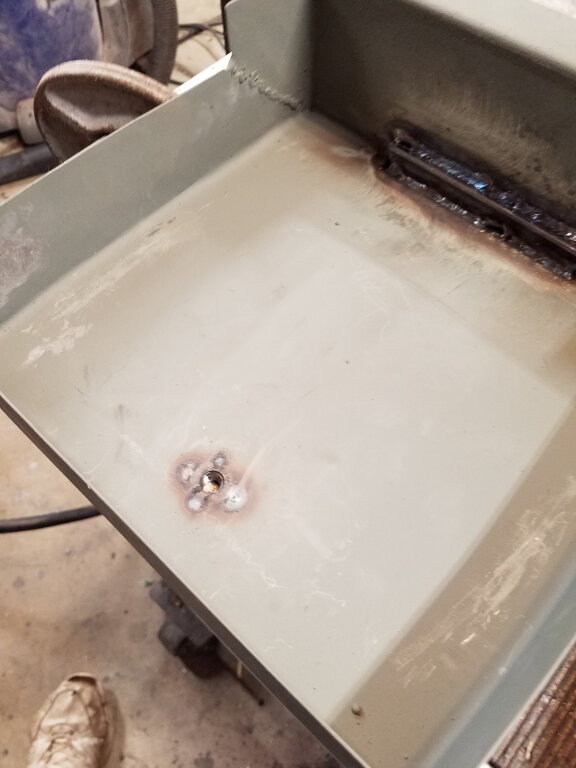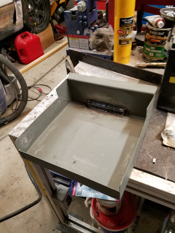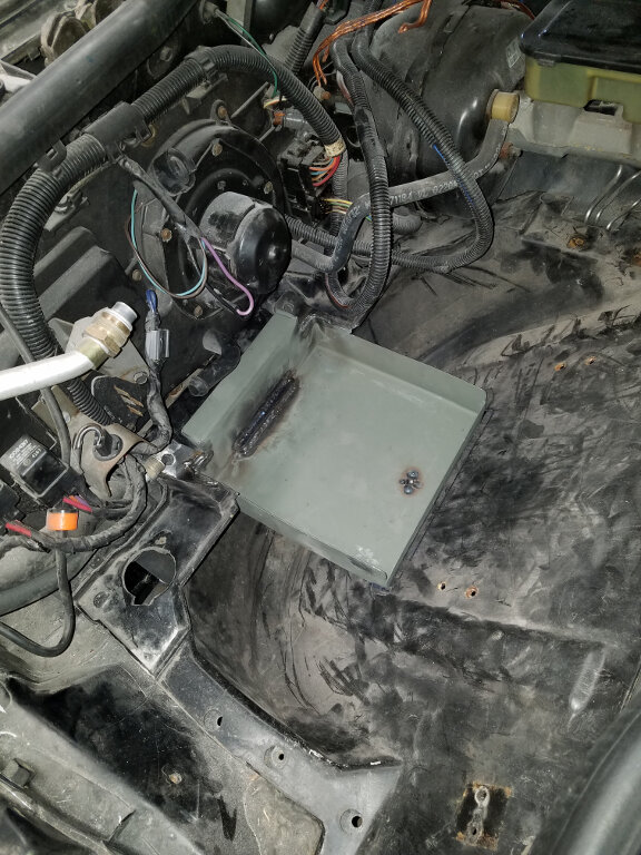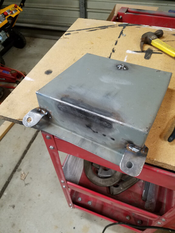I fab'ed up a new box and cut a hole in the spare panel to lower it as far as it would go. The box will mount securely to the front holes for the panel. I'll weld in some 1/4-20 inserts to bolt it in.