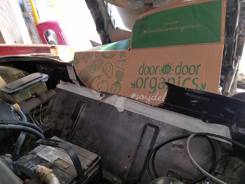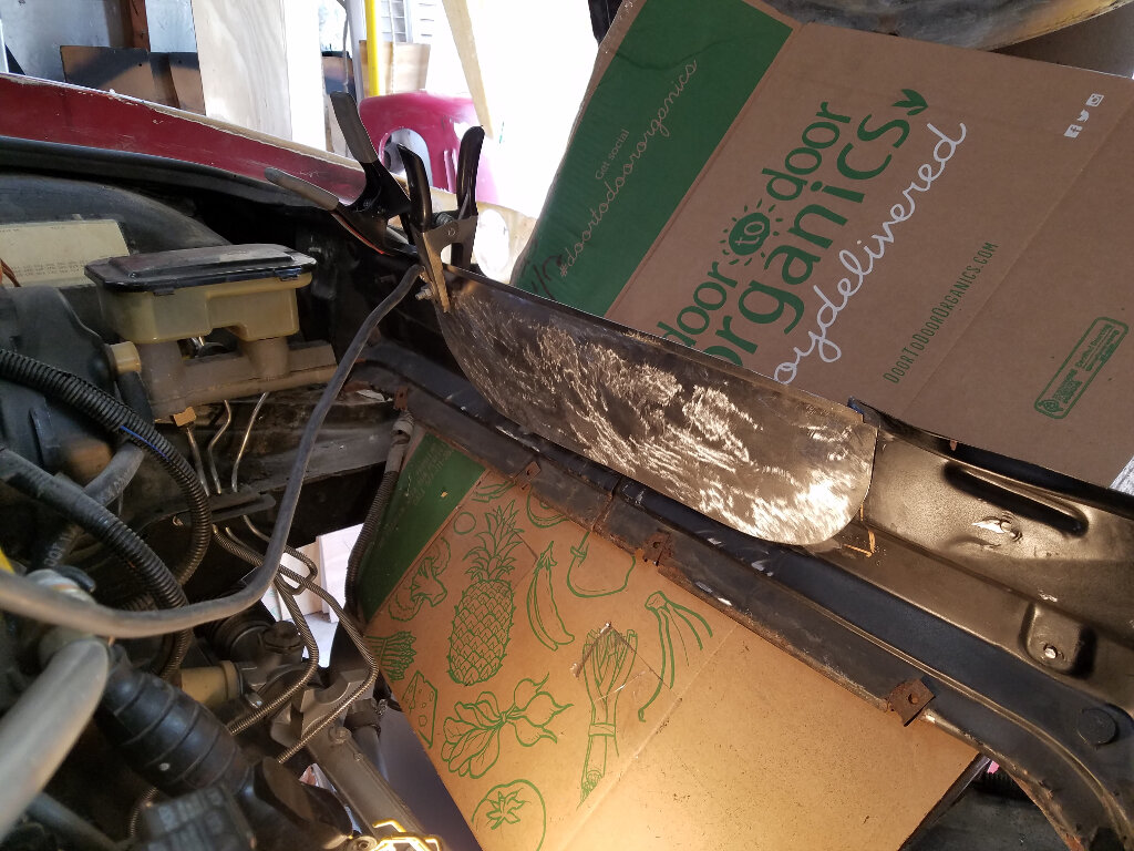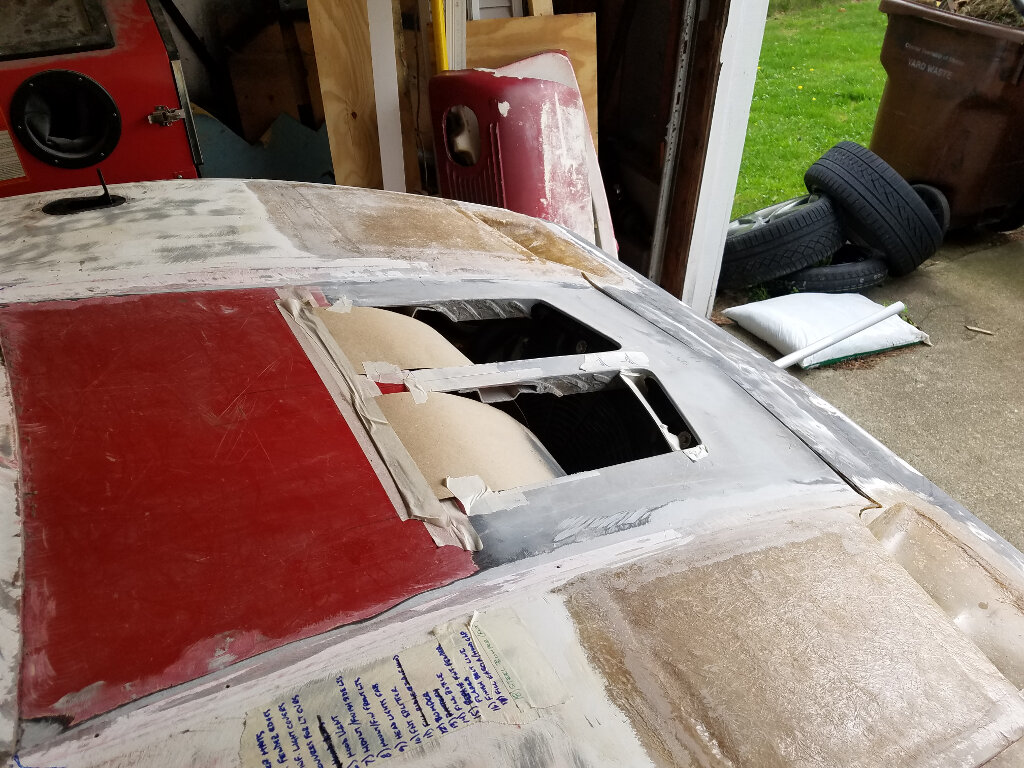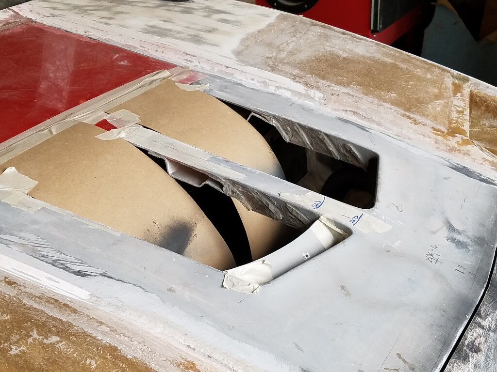 Cut the hole, then made a piece to fit under the hood skin. Note, I do not have access to the bottom side, due to the Fiero liner being underneath. The piece is then glued, using SMC adhesive.