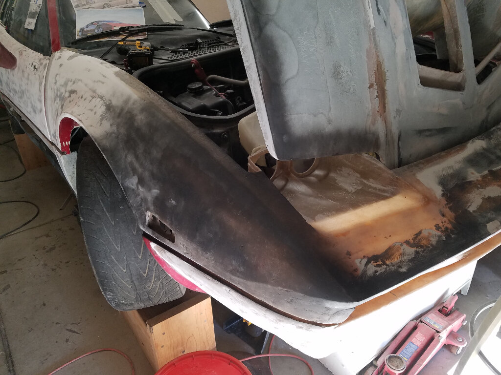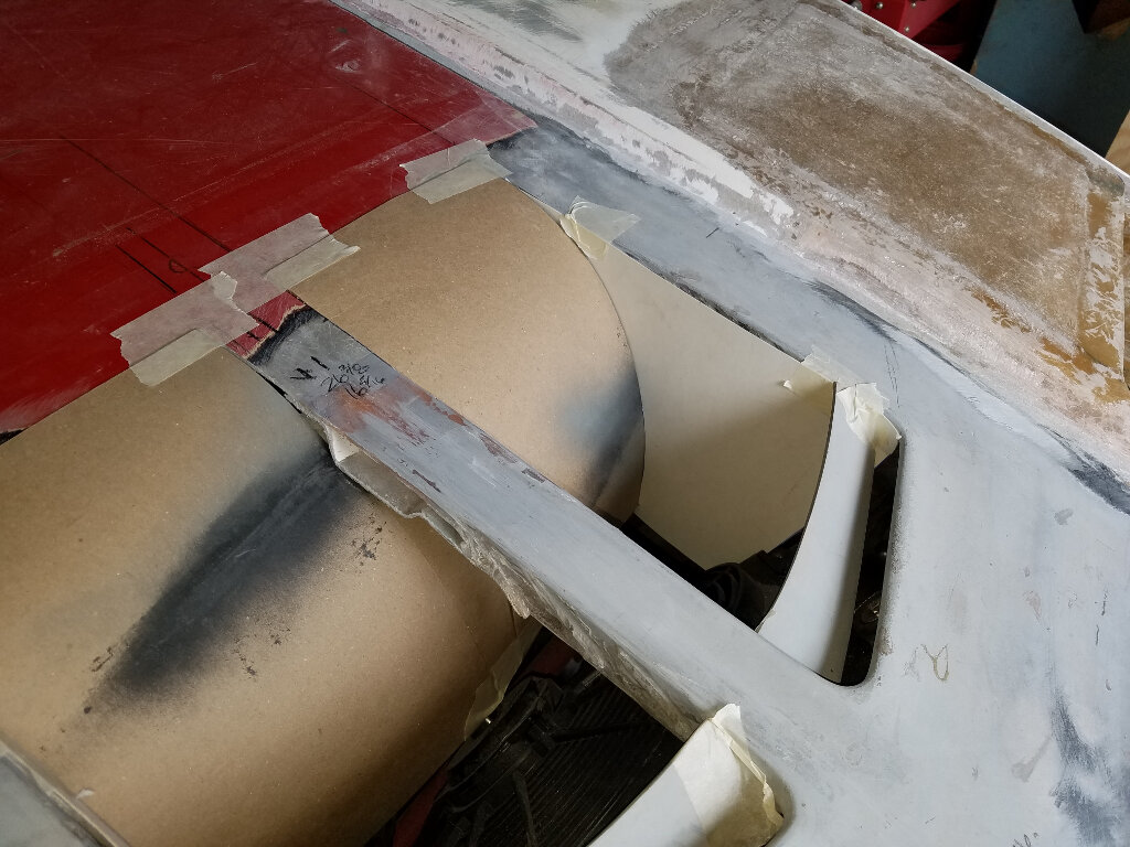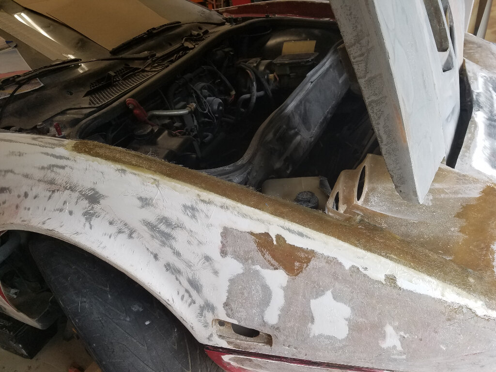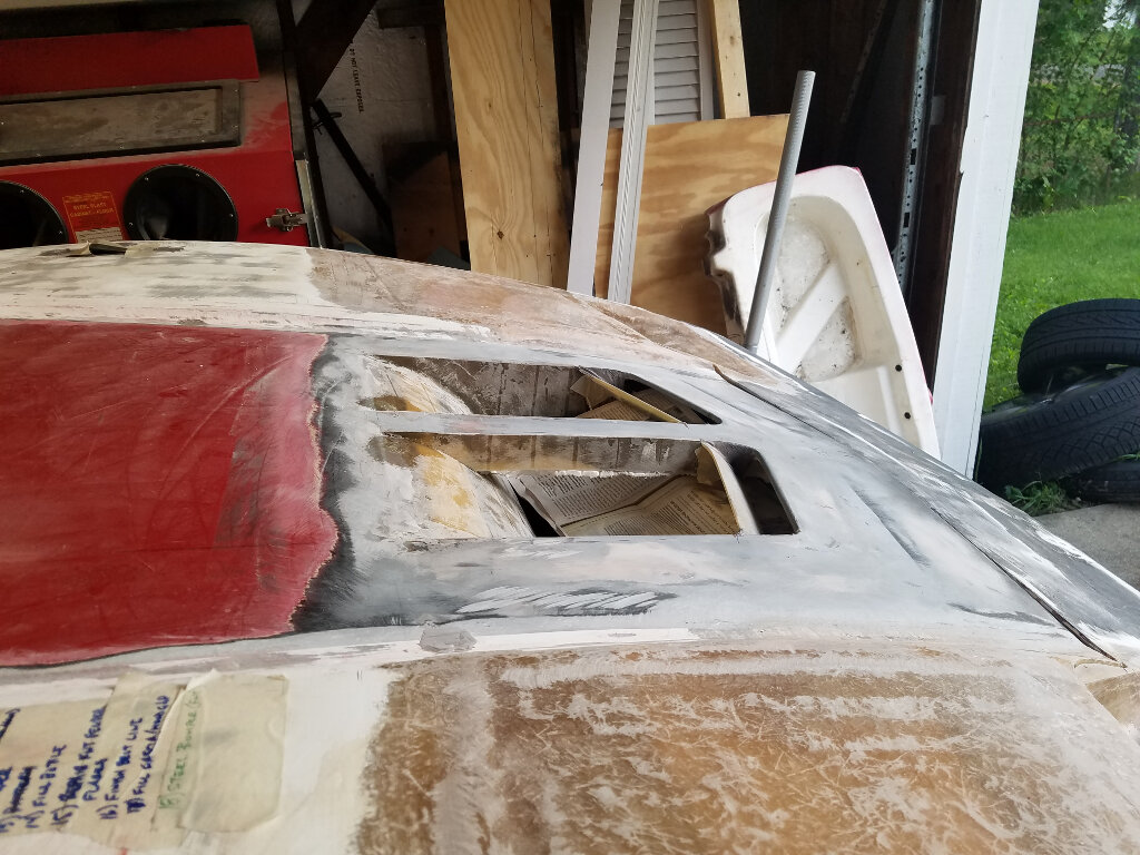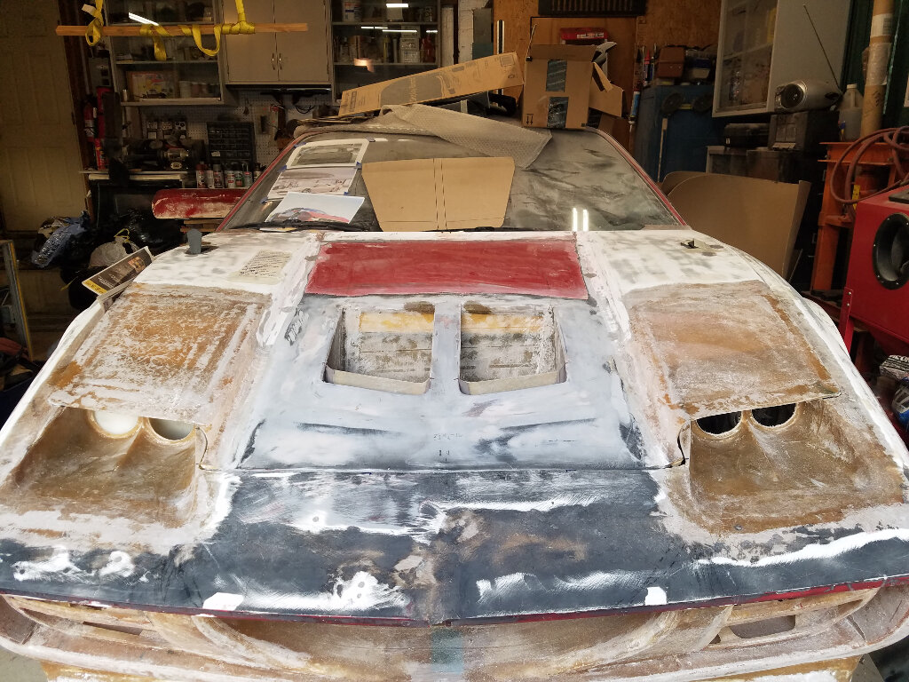 So, I've been trying to get the hood to a point where it's "done". It's not there yet, but I've been adding short-hair filler and smoothing it out. Fixing blemishes and trying to tidy it up. Hood is back on the car so I can work on panel alignment and fixing some of the damaged mounting points.