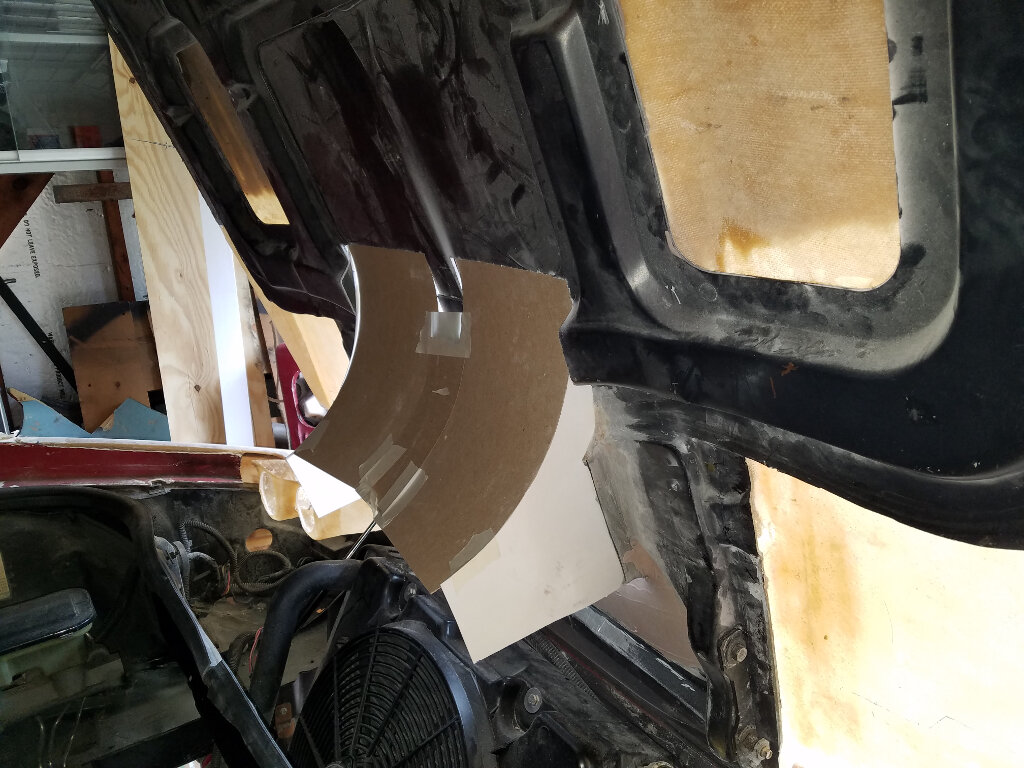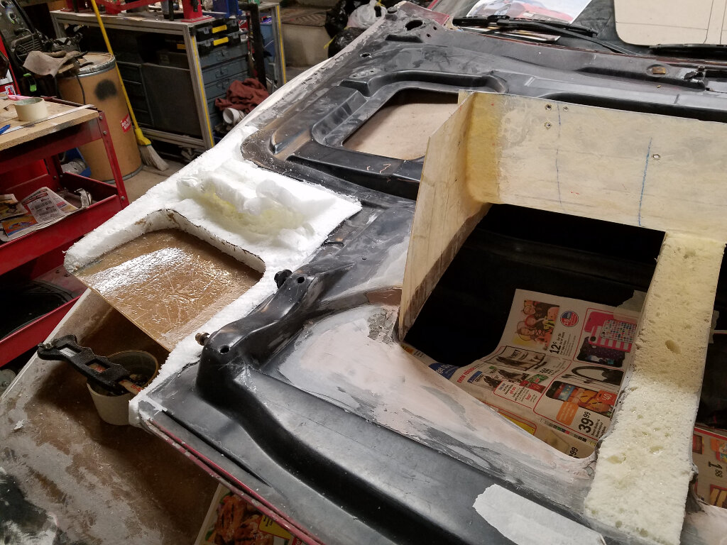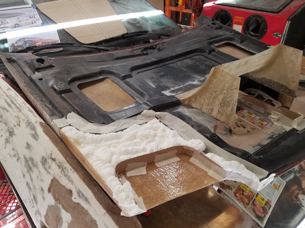So, moving along... Flipped the hood over to work on the bottom. I wanted to fix the area where the head lamps used to be. Broke out some spray foam (Locktite worked better than DAP) and started filling the gaps. First off, I made some dams out of cardboard, then sprayed away.