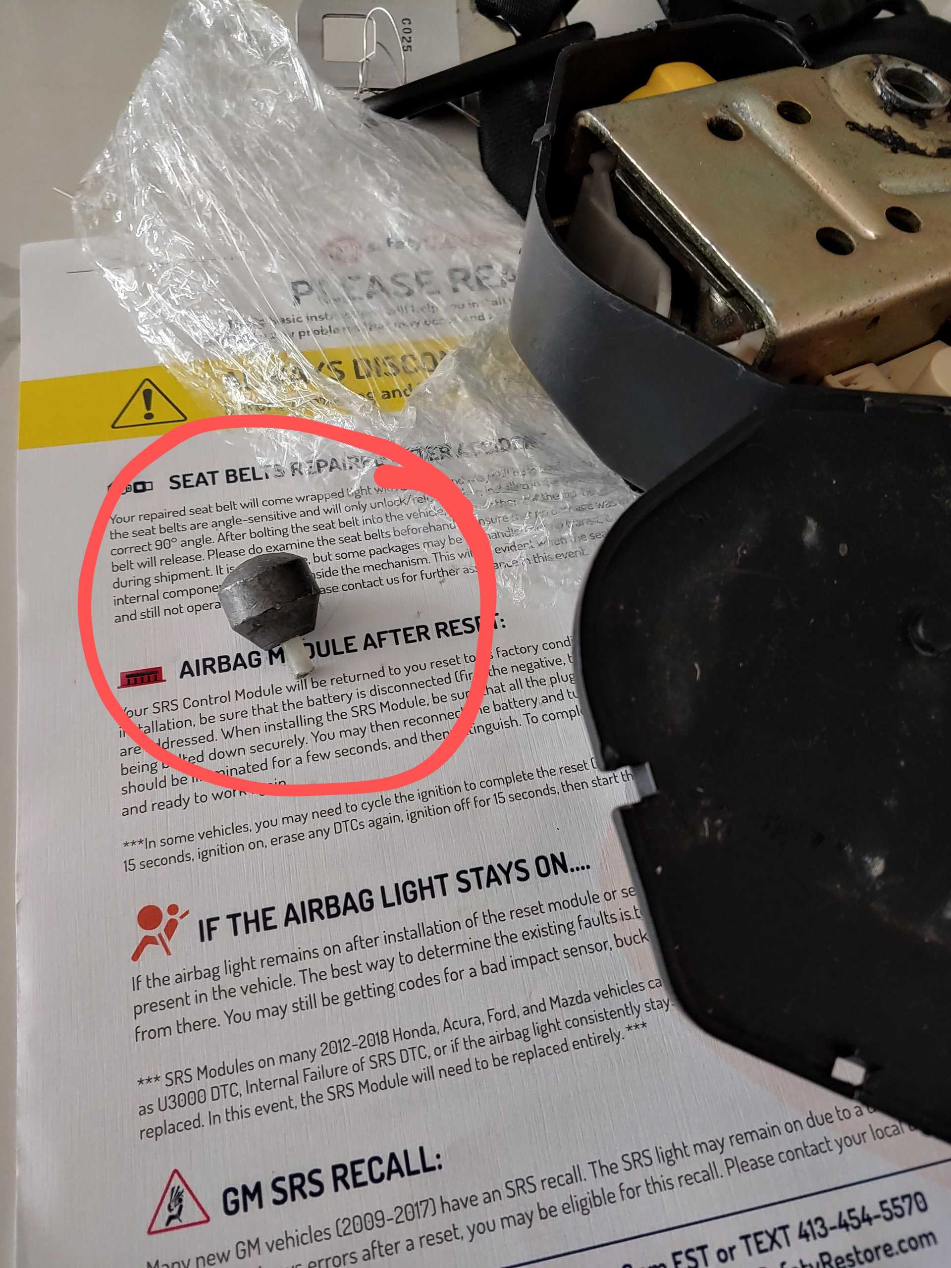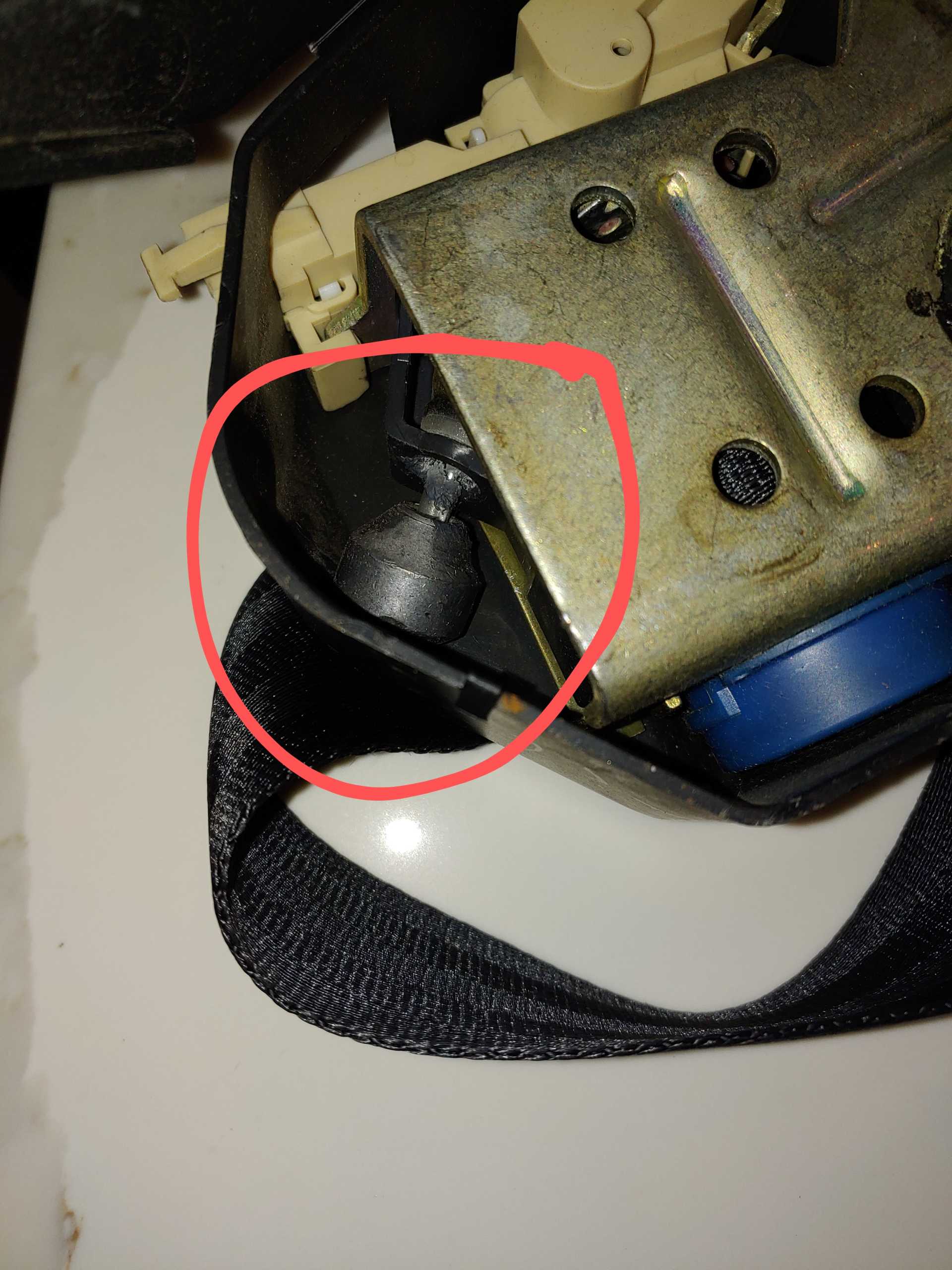 Does anyone know what this part of the seat belt mechanism is for? Is it essential to the function of the seat belt mechanism? I sent my seat belts in to be re-webbed and when I got them back, this piece was rattling around inside, it had broken off. The other seat belt is just fine.