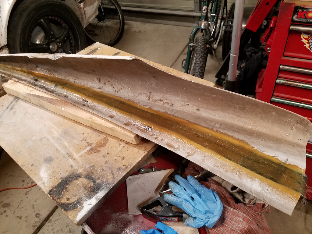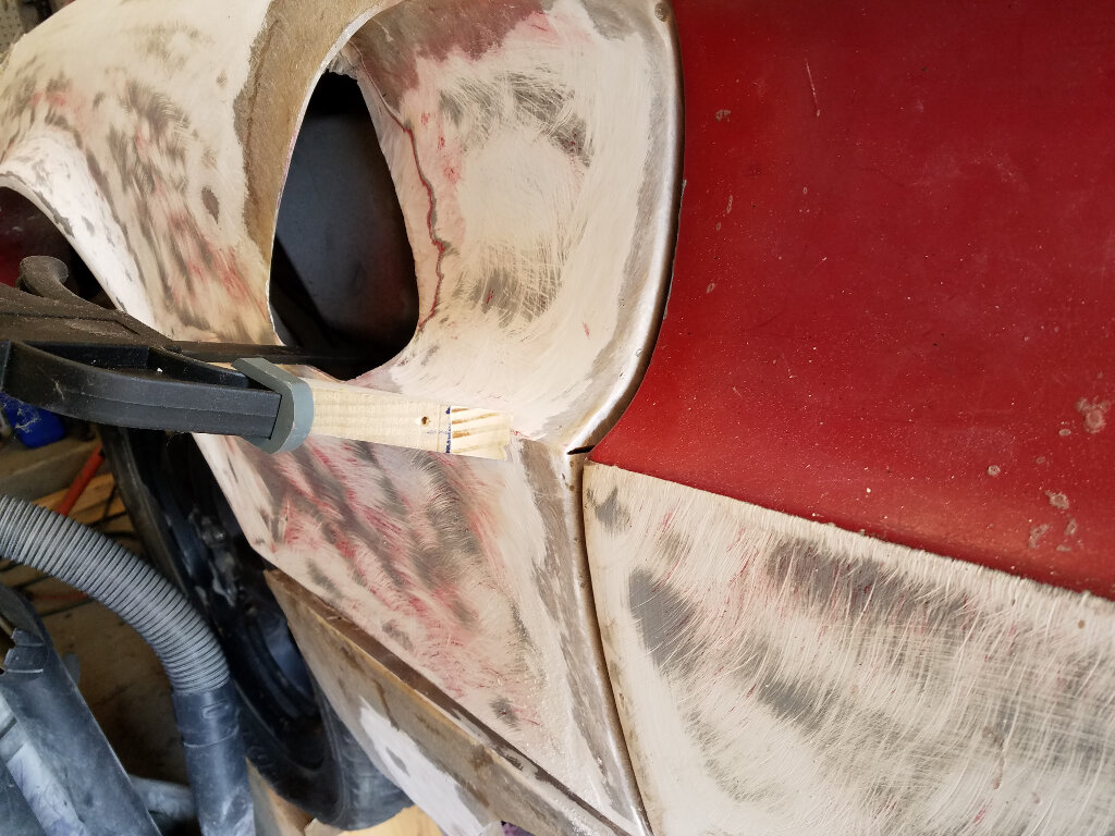 The verticle cuts above were made to releave some of the stress on the glass when I pulled the gap together. Im ground these out and applied a couple layers on it to restrengthen the part. Rinse and repeat.