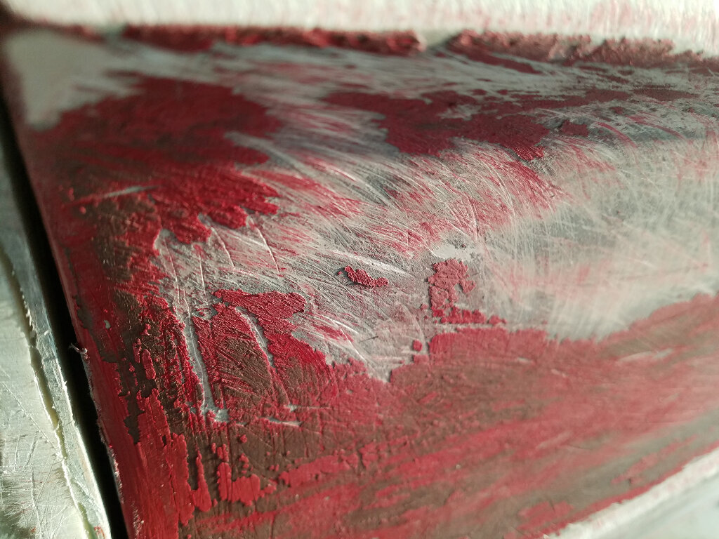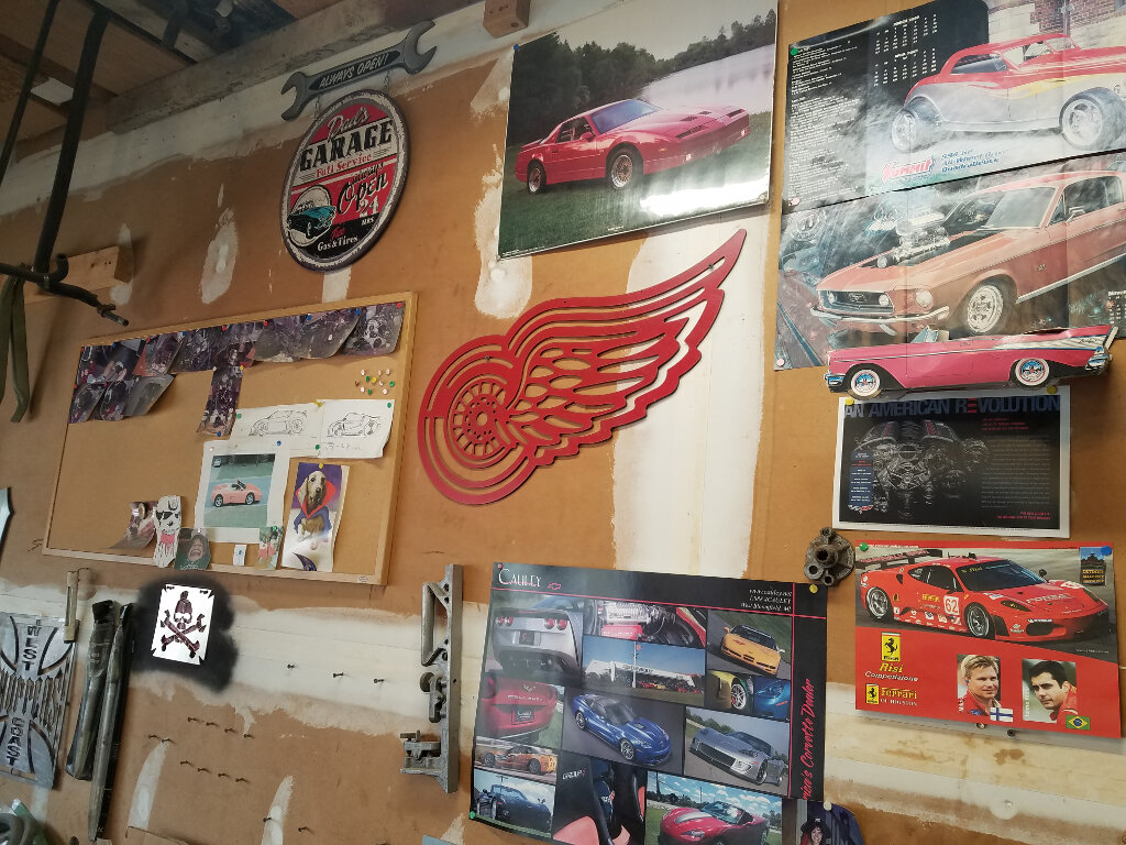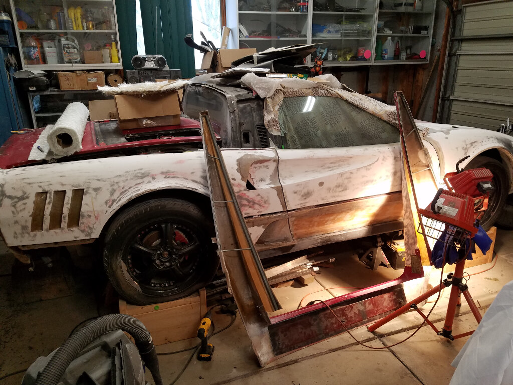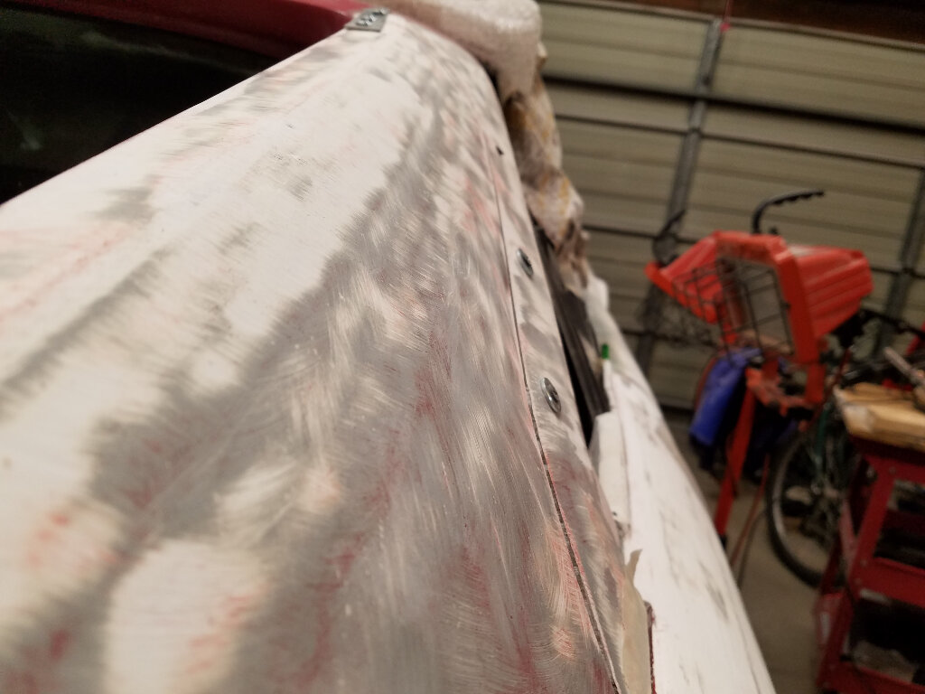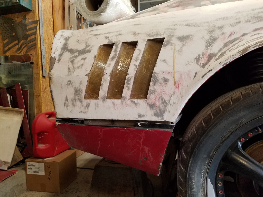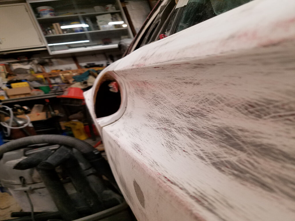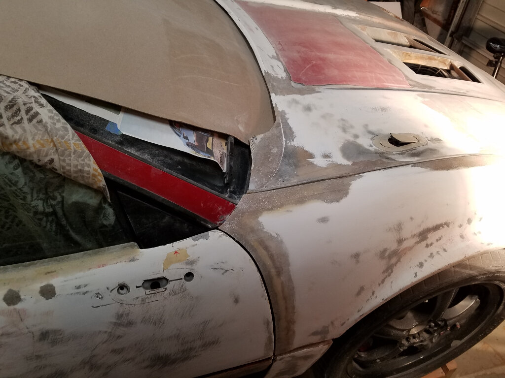 First thing to do was to take off all of that red paint. Then I had to fill the gap created by lowering the hood. Here is the end result.