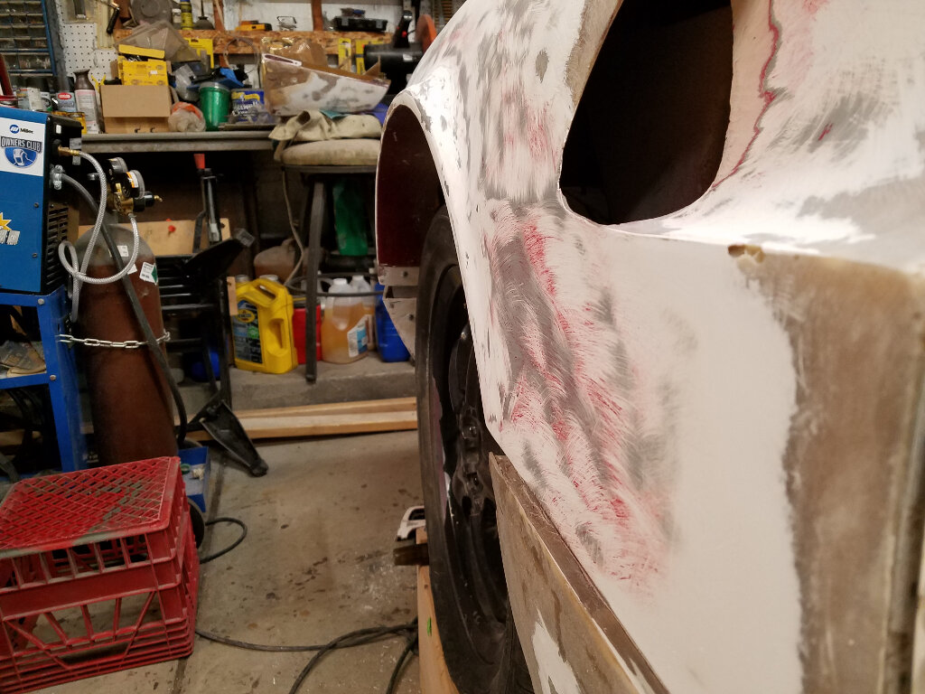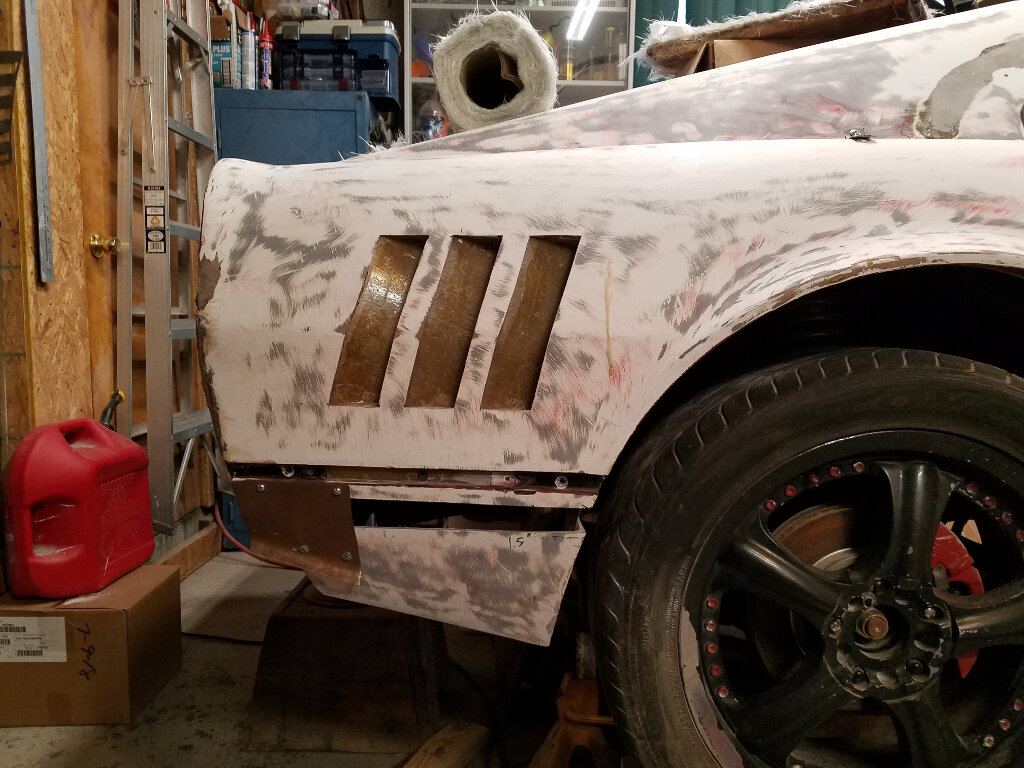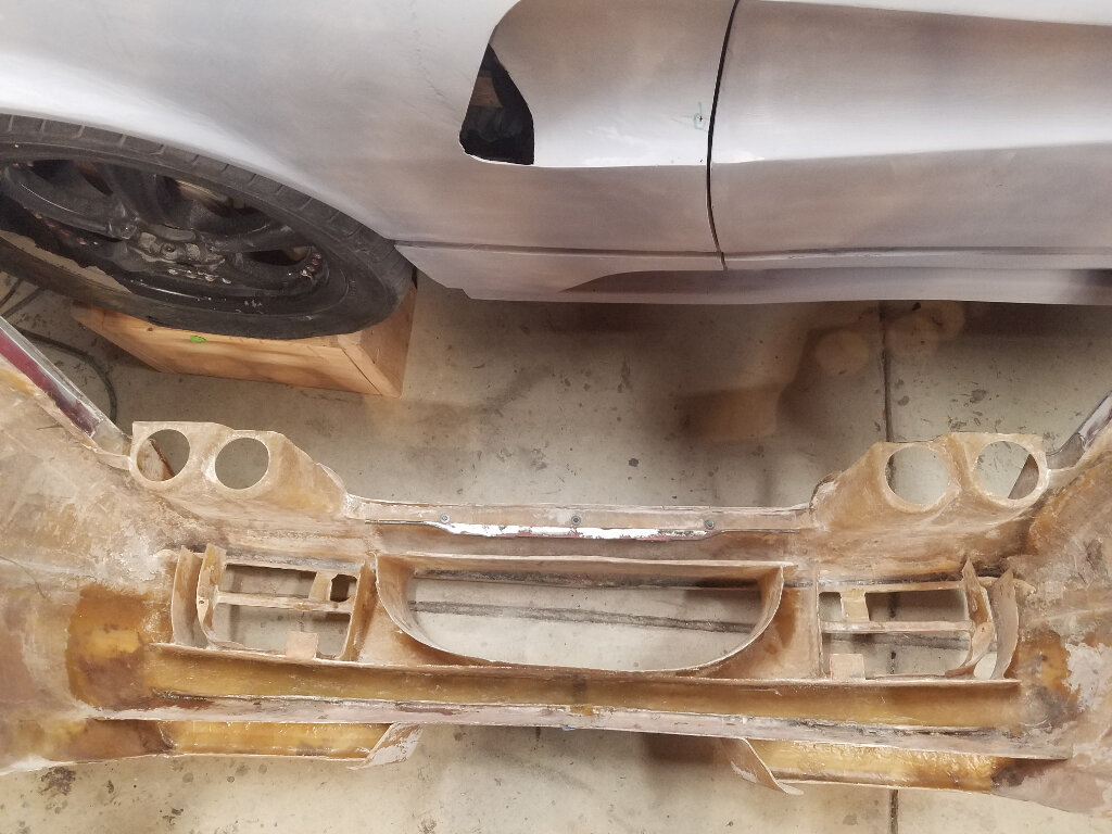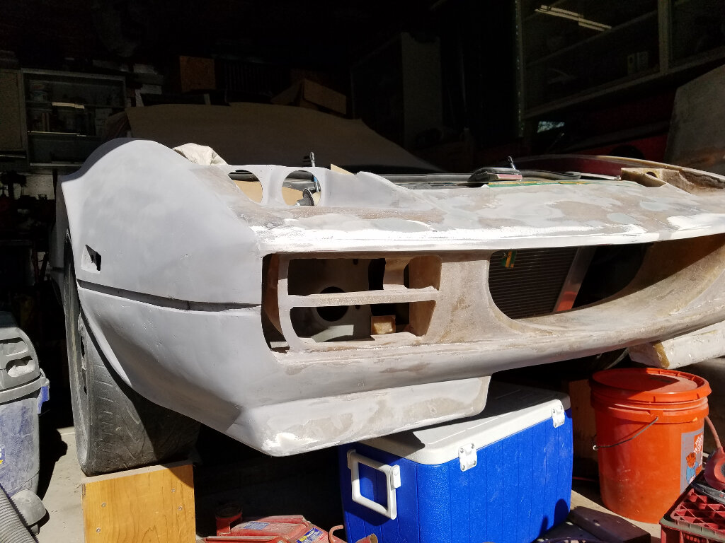 Pretty much where I'm at right now (as I sit in the AC). I've finished shaping the nose to fender transition and have been filling the top panel and grill openings.