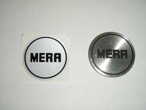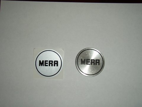 Here are a couple of photos of the Rodney reproduction center cap sticker and an original MERA center cap. I hope that you can see the difference but it is not as clear in the photo as it is when seen with the naked eye. The Rodney decal has a silver/grey background and the original cap appears to have a transparent background over a polished center cap. The sticker is on the left and the original cap is on the right.