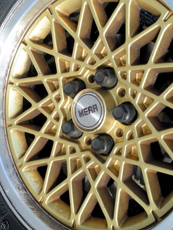 this is what my OEM Mera wheels are supposed to be painted in red, huh....... thats cool... no sticker and now, no bad to the bone rims, it's all good.... cuz thats what i wanted to see on the car any ways. gold lace type. notice the center cap? cool more goals. out Dan
