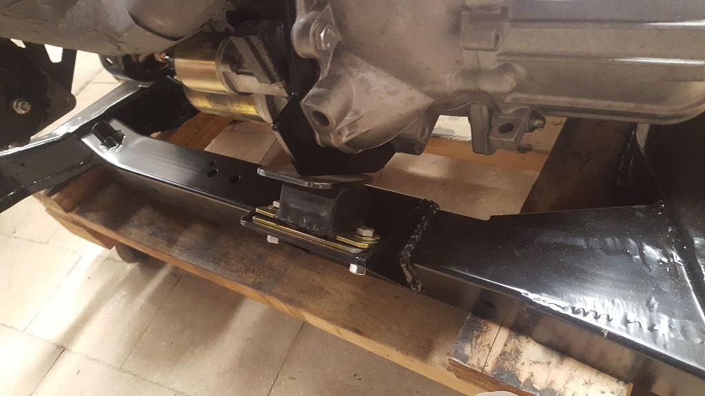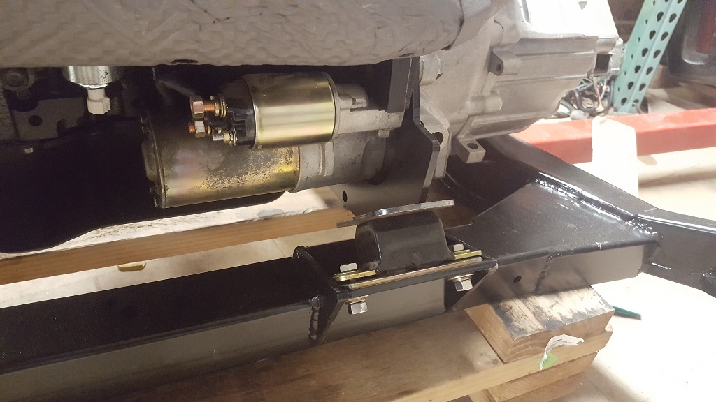 This is the front trans mount. I have not welded it completely but you get the idea. It is welded to the trans spacer I made. We added a small tab to use as a mount point.