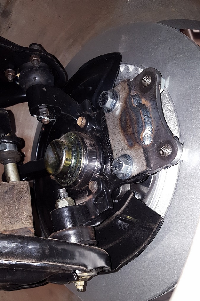 We made the caliper bracket in two parts to get the offset. To get the correct spacing it would be hard to measure. So we bolted the two parts to the caliper and the spindle and set the caliper on the rotor. I used two small ~1/8 spacers to keep the caliper from resting on the rotor. Spun the caliper to the correct position and tac welded the two parts. Took it apart and welded the bracket up.