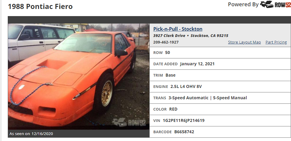 Pick-n-Pull of Fresno CA is showing 1G2PE11R6JP214619 in their yard; four-cylinder base model although someone has given it a vented hood and aero nose and lower rockers. And an orange paint job! I've been to this junkyard in the past and cars come and go quickly. |