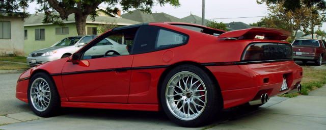 Not a great pic of the wheels, but they are 17x7.5 Fuzion GT Drift wheels (Ebay) +40mm backspacing, with 225/45-17 tires & Pontiac carbon-fiber center caps.  [This message has been edited by 87RedRum (edited 12-14-2015).]