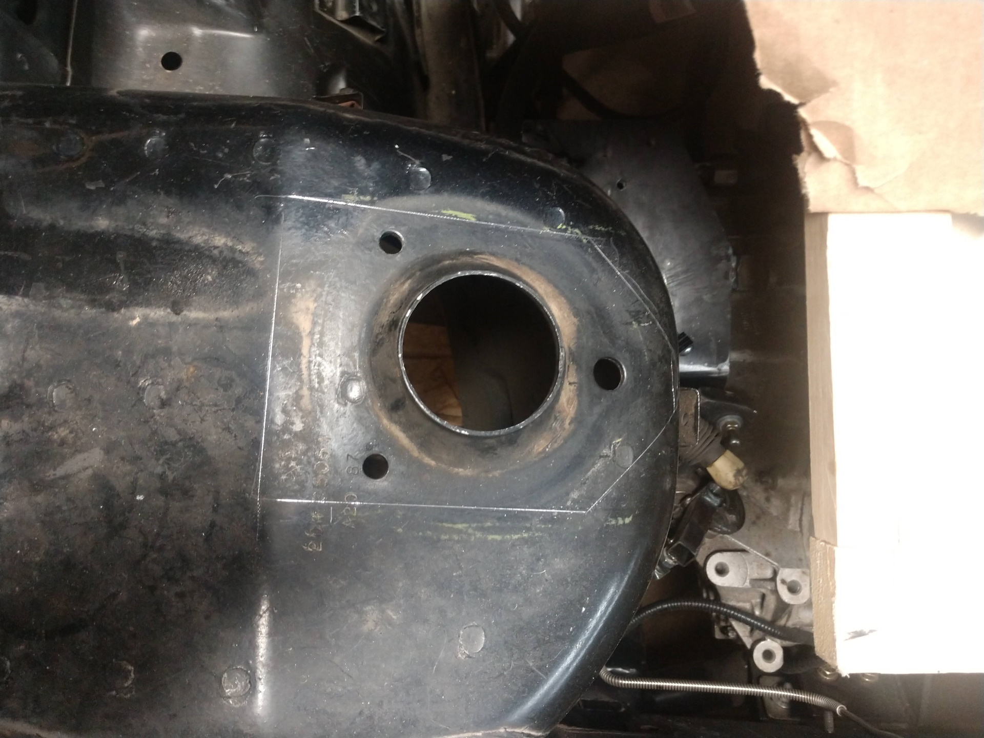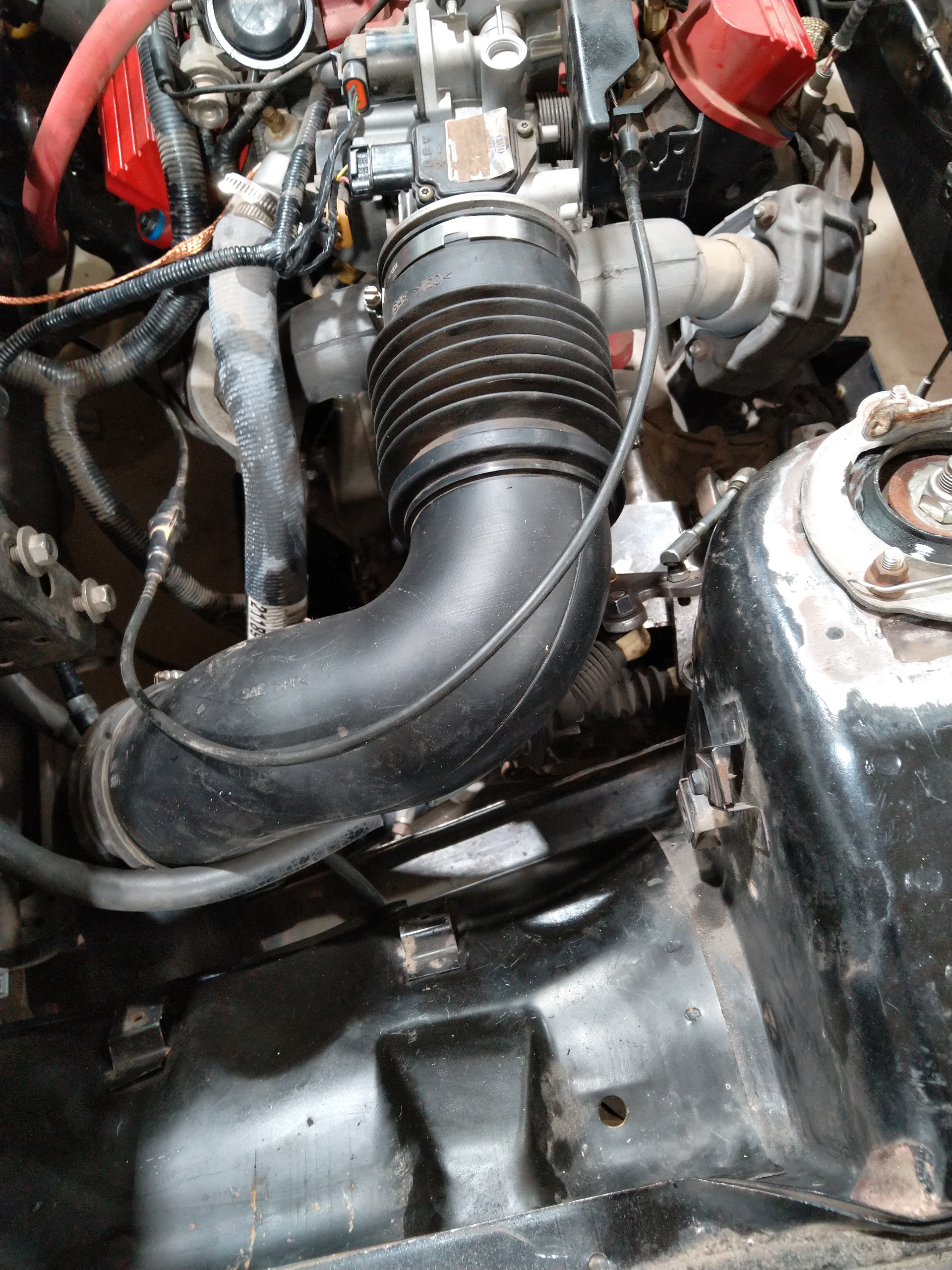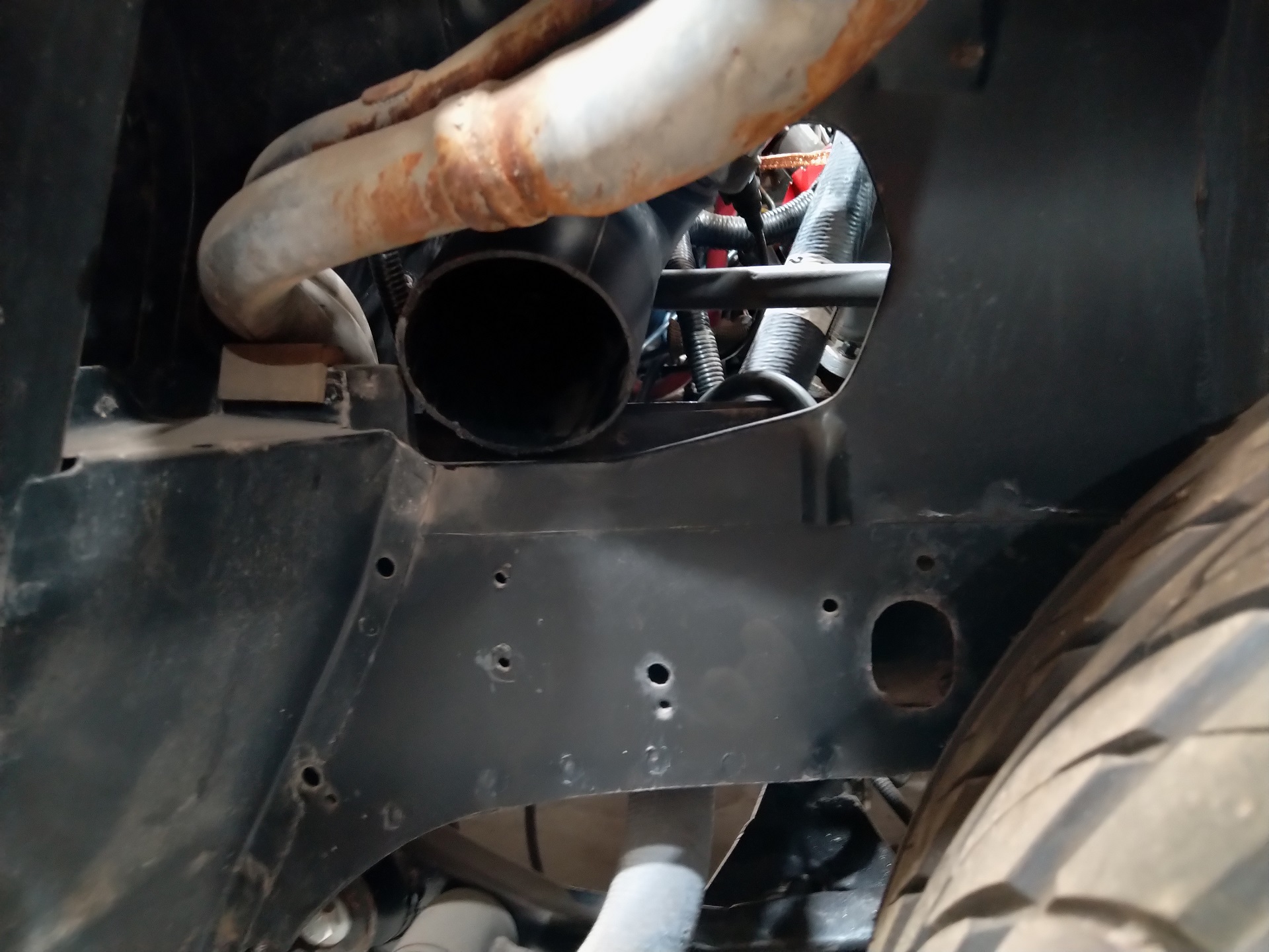 Intake installed. GMT800 (1999-2006 Silverado/Sierra 4.3L) air induction tube cut to fit, using a K&N filter mounted in front of the left rear wheel in that space behind the inlet grate. K&N Universal Clamp-On Air Intake Filter: High Performance, Premium, Washable, Replacement Filter: Flange Diameter: 3.5 In, Filter Height: 7 In, Flange Length: 0.875 In, Shape: Round Tapered, RU-3130