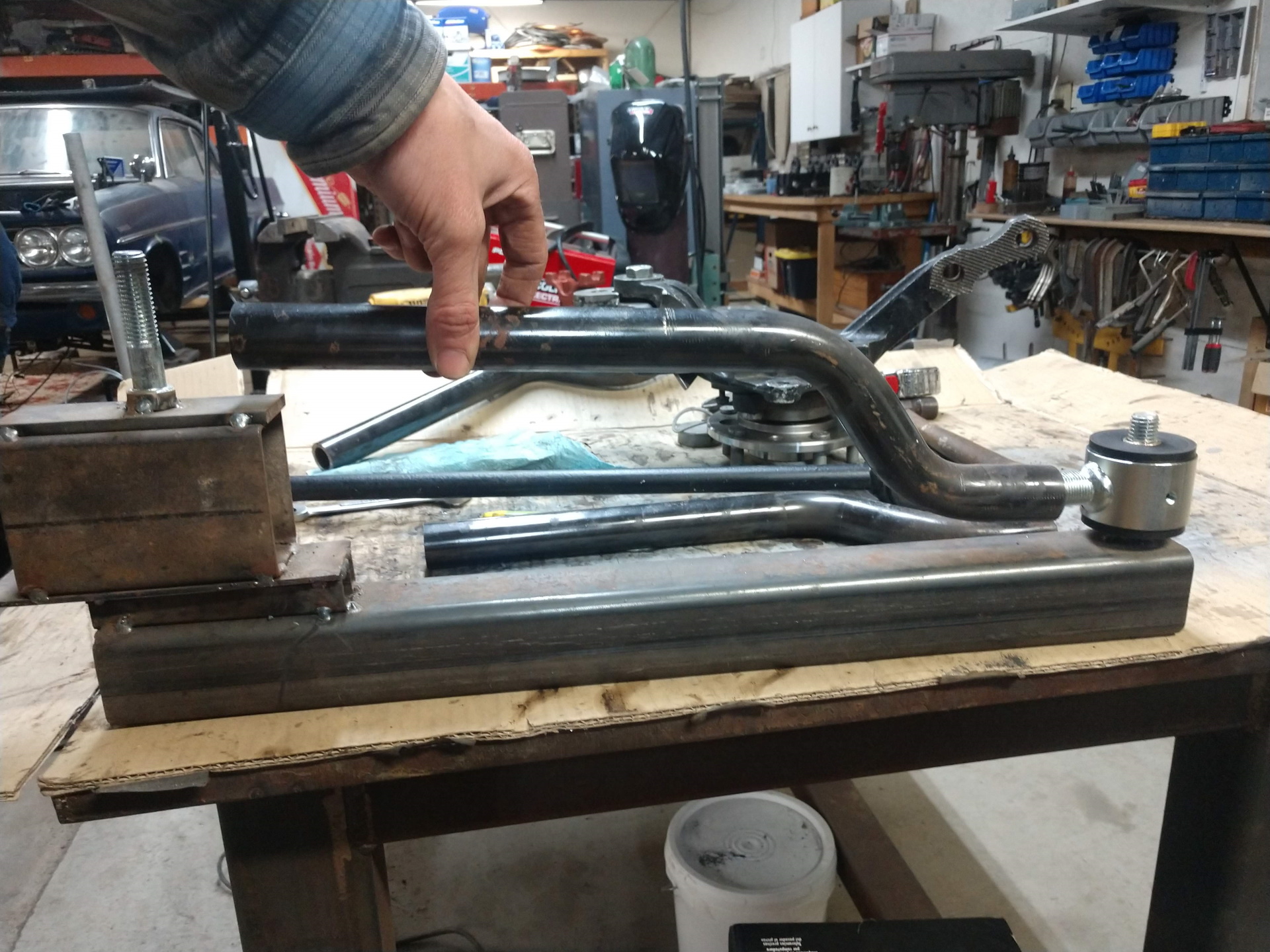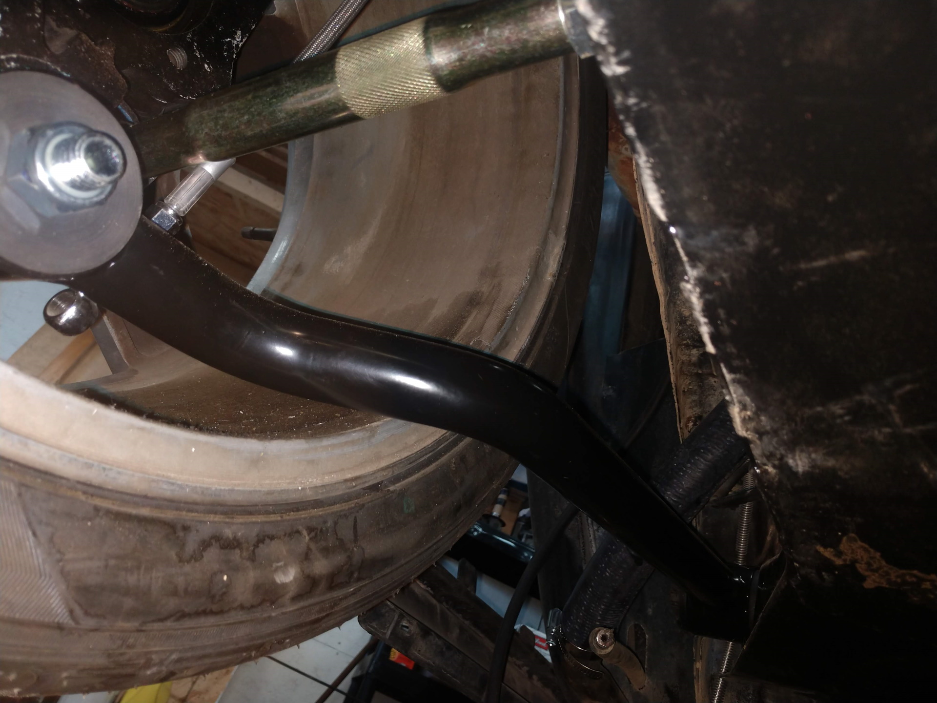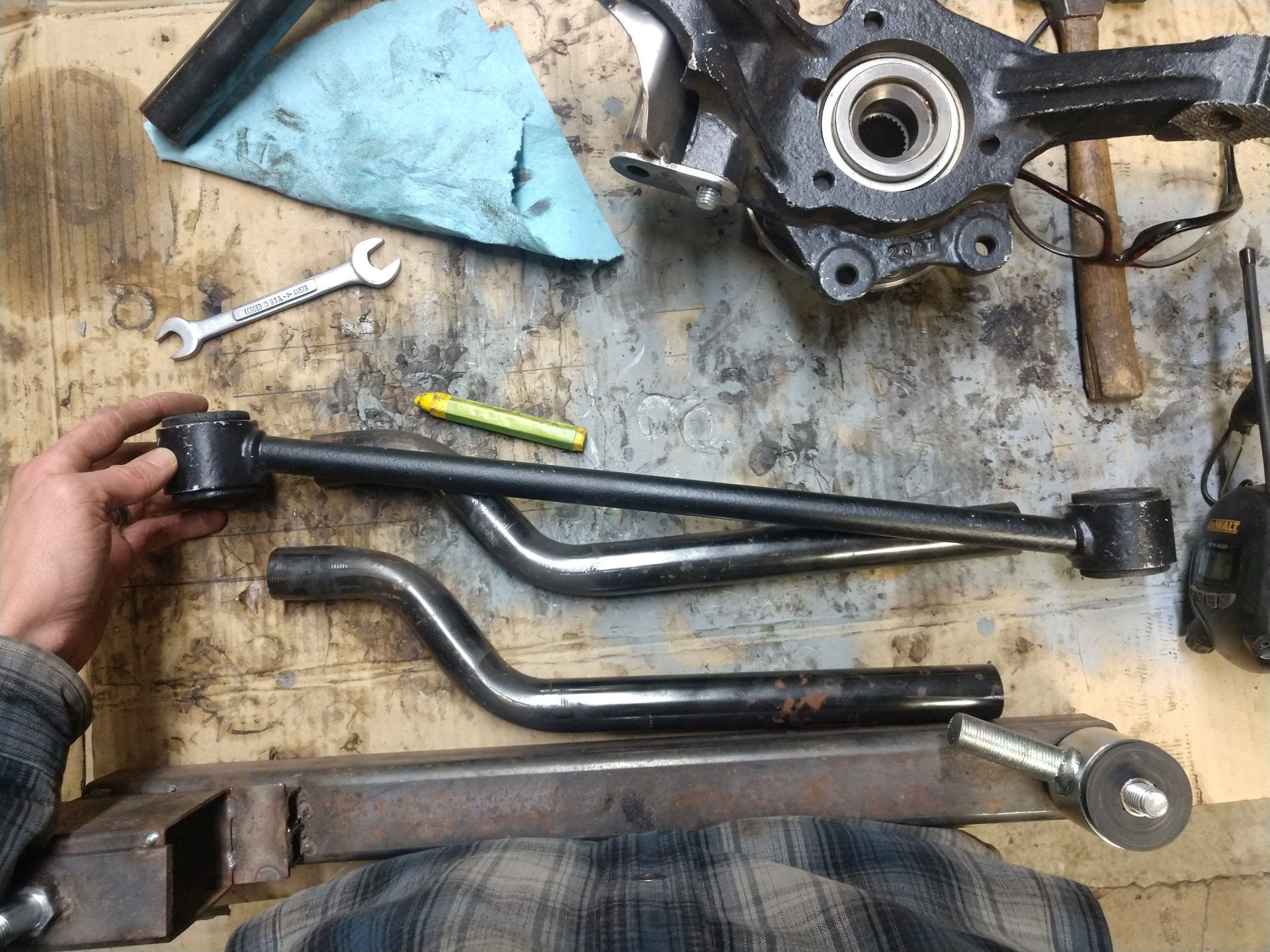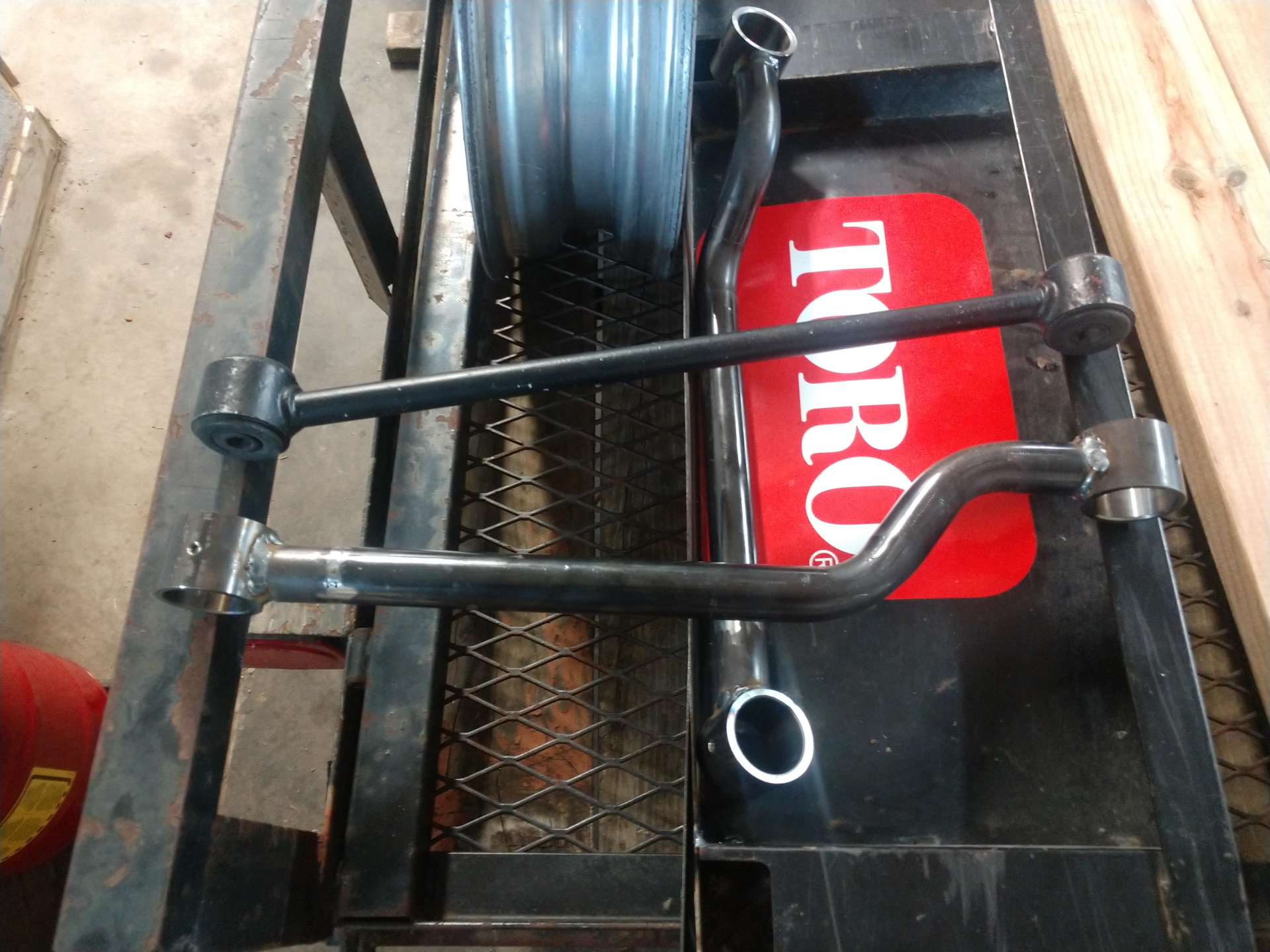 We are taking some scrap sway bars and making the forward link? not sure on the name. But it interferes with the rim. You can see in the pic that it will bump in toward the car and then turn and go forward.