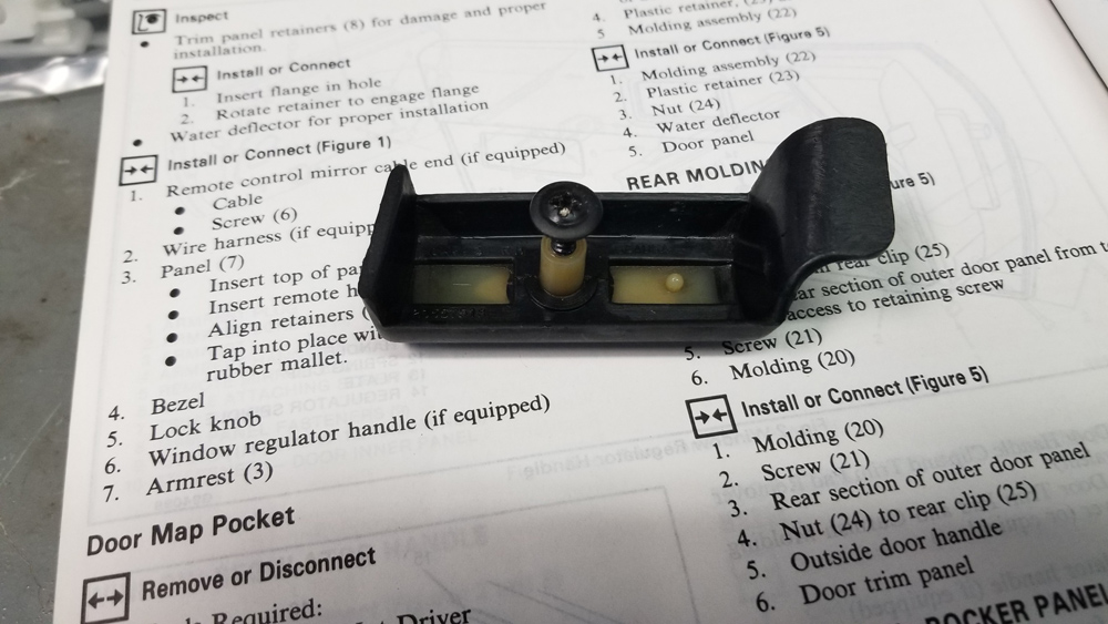 I searched all over the shop for that section, including my big Fiero parts bins and extra boxes. I finally found it, in the plastic container I used for all of the parts of the door when I originally took them apart last summer. I was so disgusted with the whole process I just left.