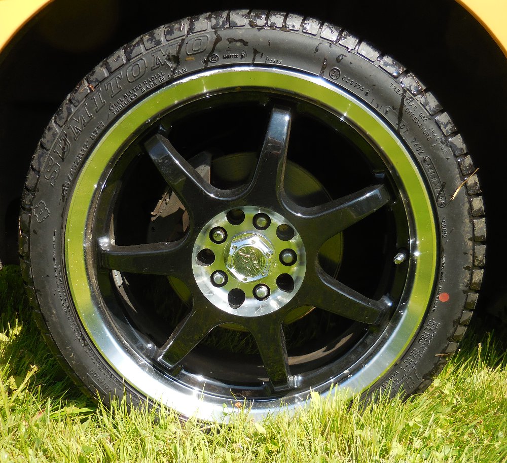 !7" x 7" HD red wheels from SD Wheels 205/45/17 front, 225/45/17 rear.