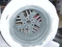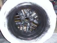 The wheels have been an absolute nightmare. I'm about ready to chuck it in, get them as good as we can and call them winter wheels and then look for either a nice set of the GT lace wheels in black, or a nice set of 16" aftermarkets for her for the summer. We'll see though I guess. It is harder when you are spending her money. We'll see what comes about. After all she might not need winter wheels. After spending this kind of time and effort on the project she is already talking about buying a "beater" car for when it isn't nice out and taking to school. She is already worried about people scratching it or hurting it......I guess that is what you get when she pours her heart and soul in, so I can't complain about that either. Anyway, here are the wheels.