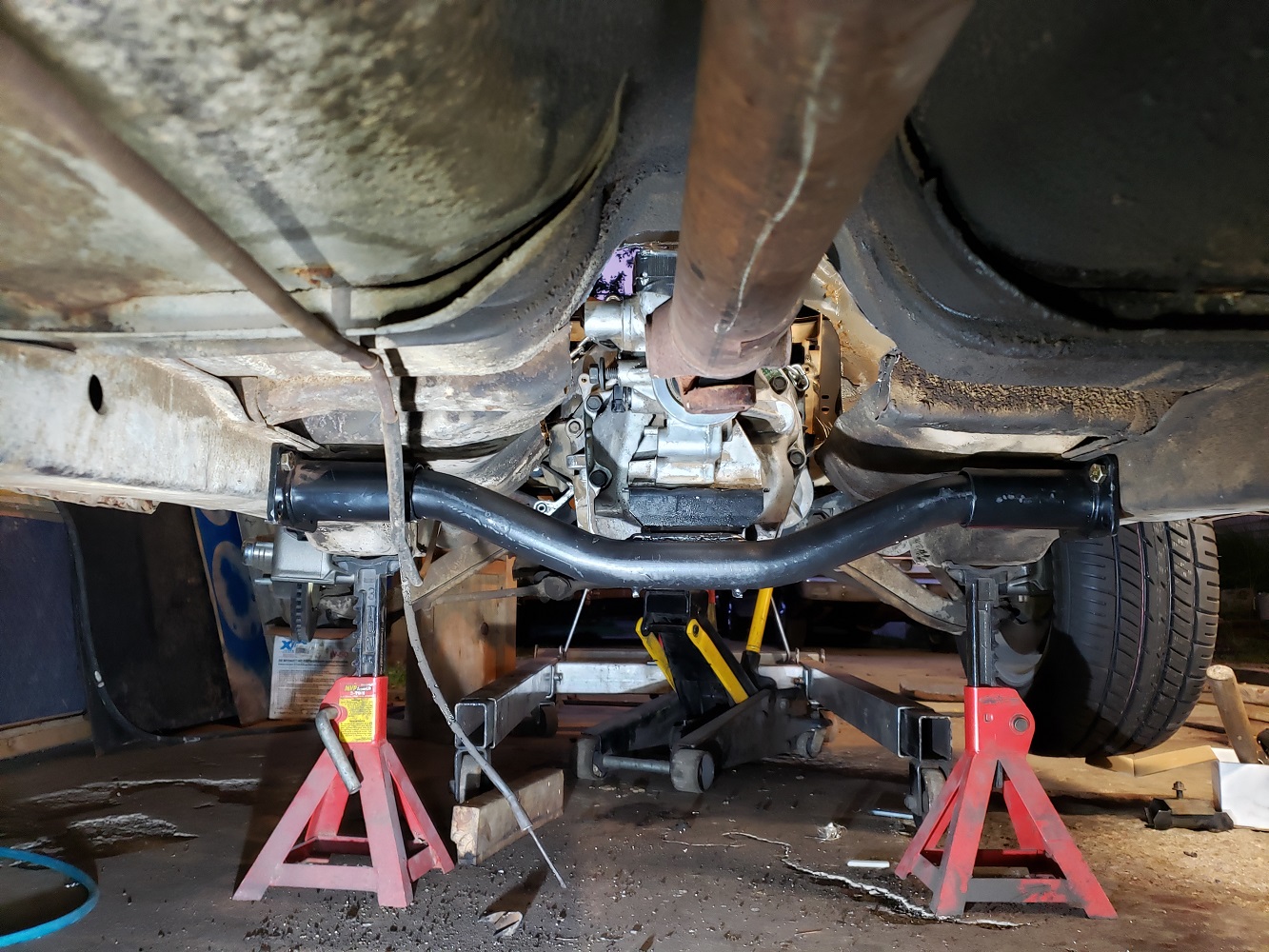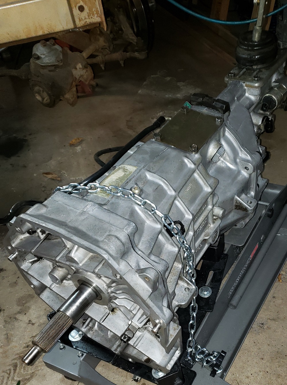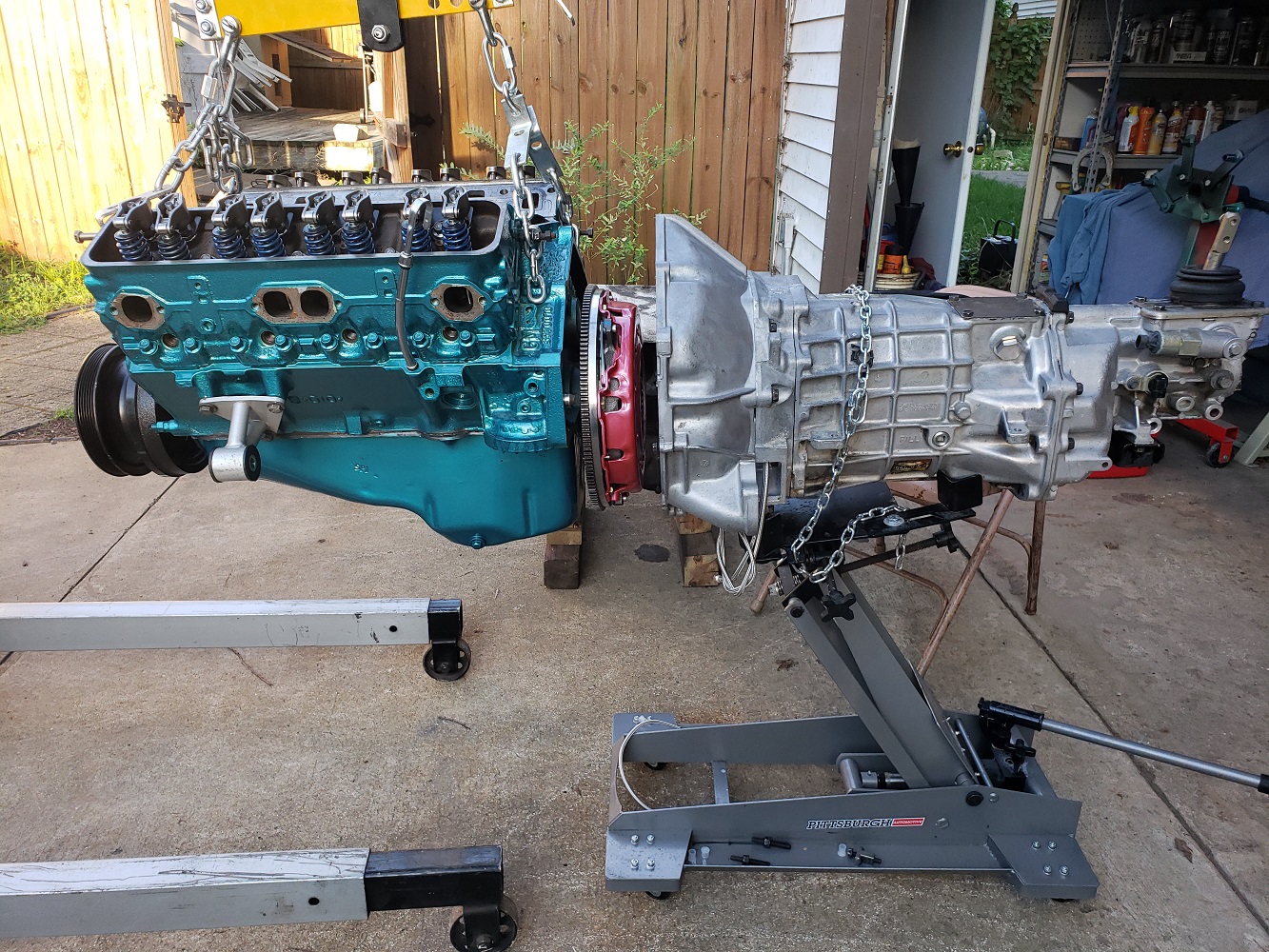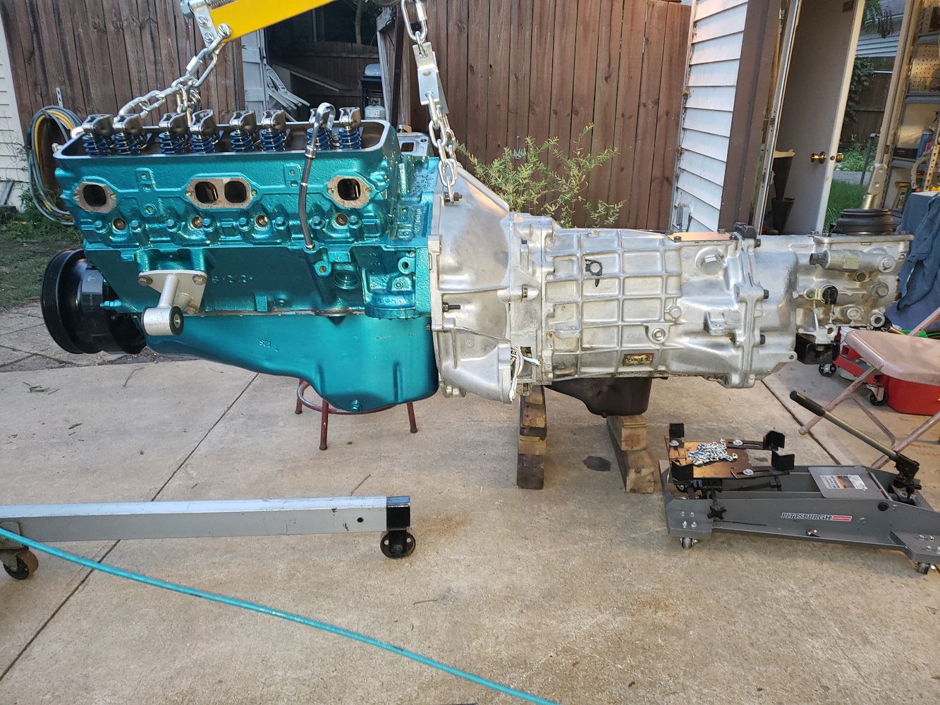 Now that there is something for everything to sit on I figured I would put the motor and tranny together and in. It rained so it was perfect for cleaning up the trans in the driveway with Purple Power during the rain.