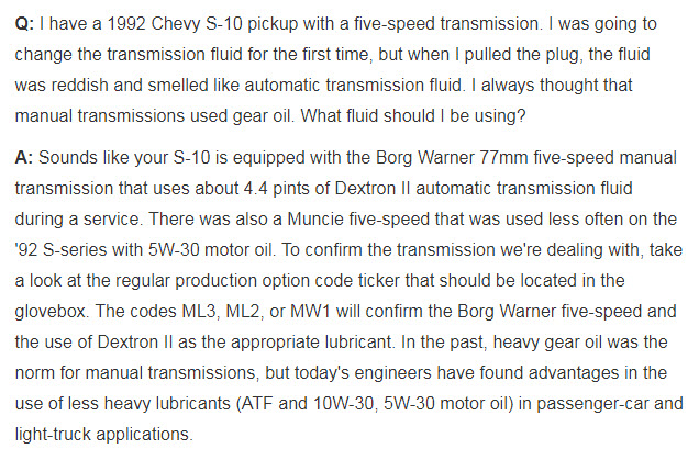 The Haynes manual says to use Dexron 2 ATF in the 5 speed MANUAL transmission in my 1992 S10 2.8 V6. Is this a typo or is this correct? thanks jon