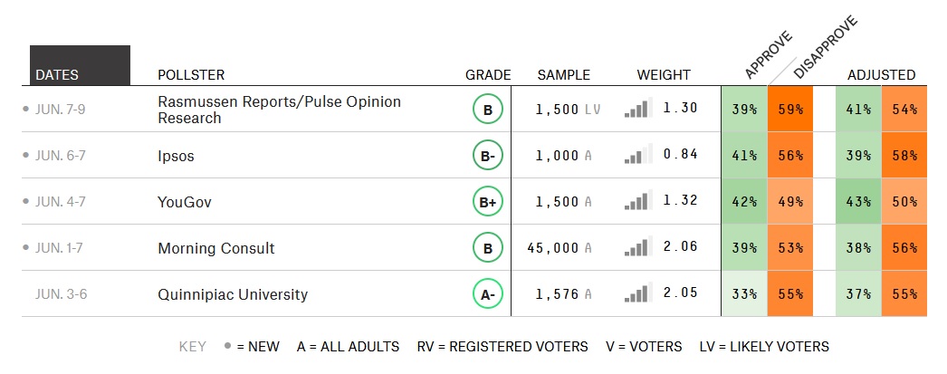 Yes, I totally understand that they change weights and add more value to some polls while they decrease value to other polls. If we were to do a simple average of the above polls, it would come out to 38.8%. Right now, his polling instead stands at 40.2% and the graph's popularity line seems un-phased no matter how much the un-popular line grows.