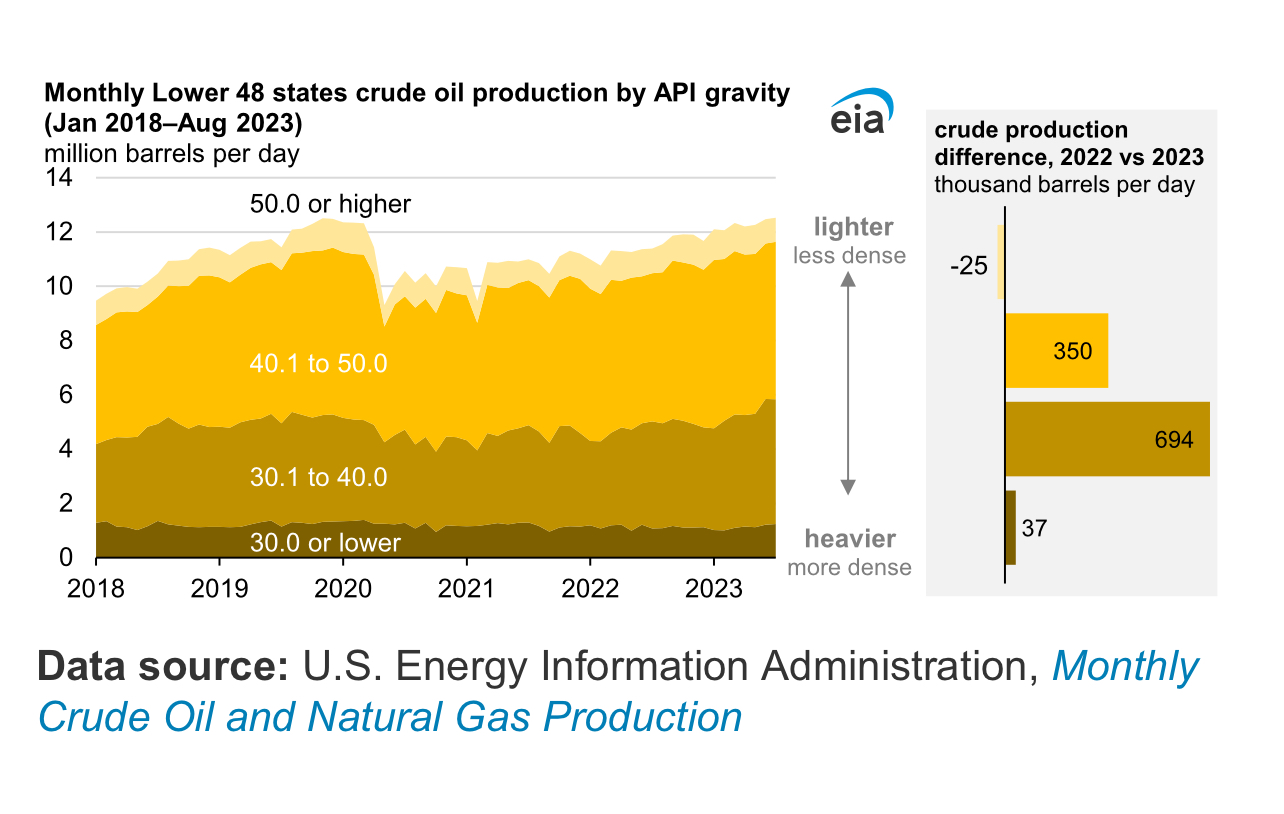 "Although exports increased in the first half of 2023, the United States still imports more crude oil than it exports, meaning it remains a net crude oil importer. The United States continues to import crude oil despite rising domestic crude oil production in part because many U.S. refineries are configured to process heavy, sour crude oil (with a low API gravity and high sulfur content) rather than the light, sweet crude oil (with a high API gravity and low sulfur content) typically produced in the United States."