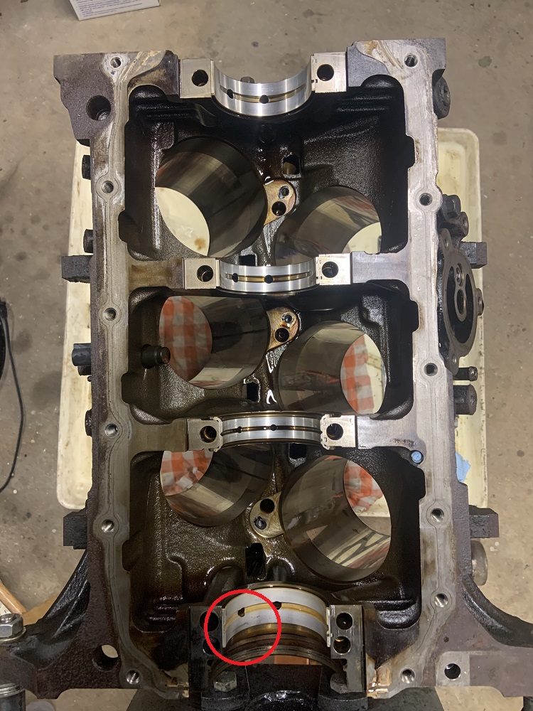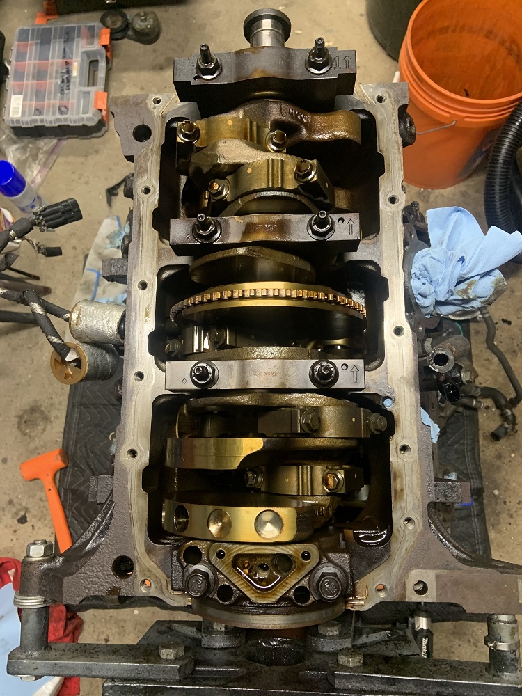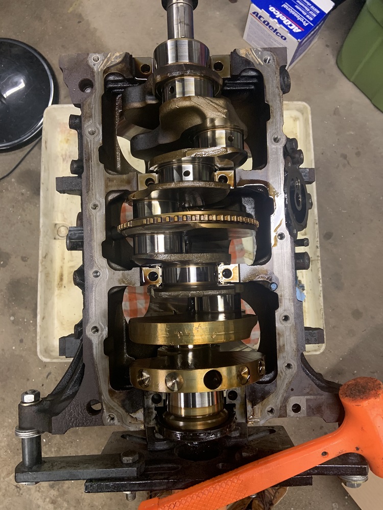 The main and rod journals on the crank look perfect. The rod bearings look perfect. The bearings in the block look decent, but the rear bearing looks not amazing.