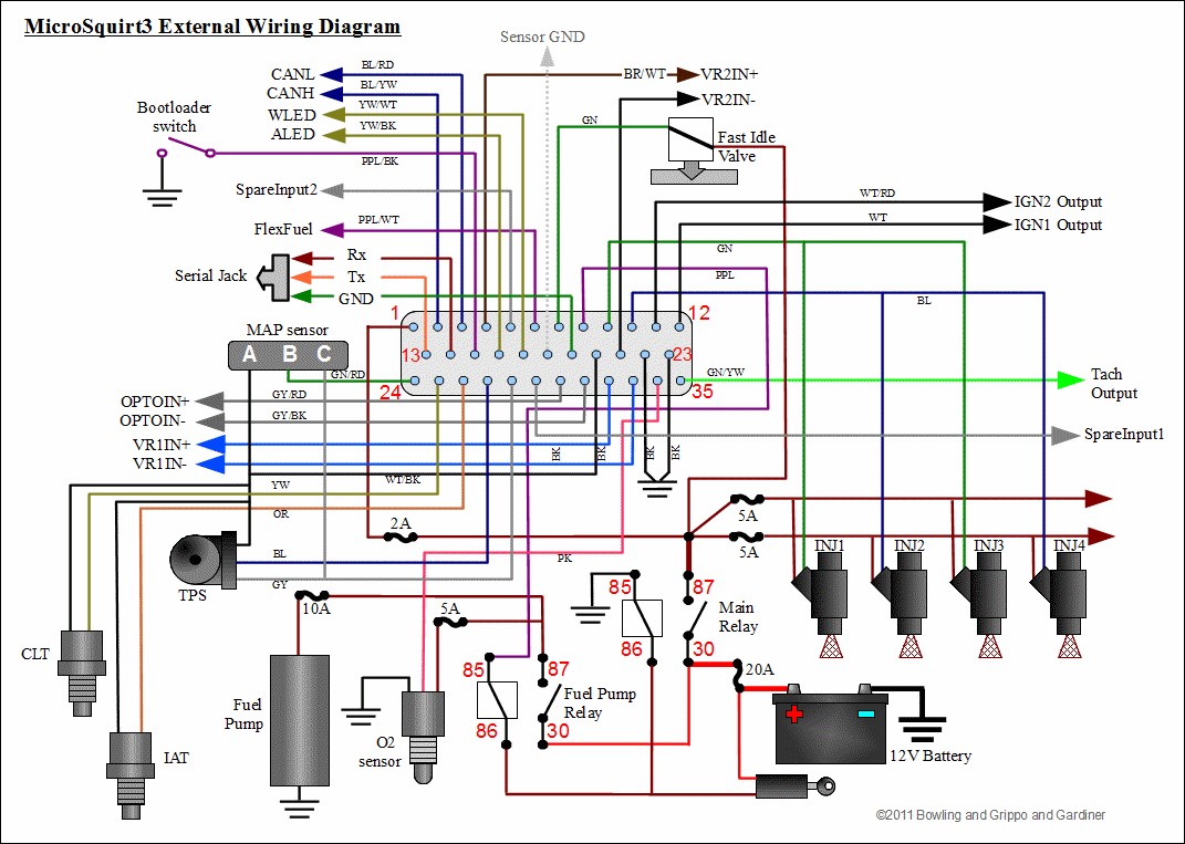 Interesting stuff and good to consider, here is a diagram for the MicroSquirt, I have to do more research to figure out which of the remaining outputs could be used to drive the coolant temp and oil pressure gauges.