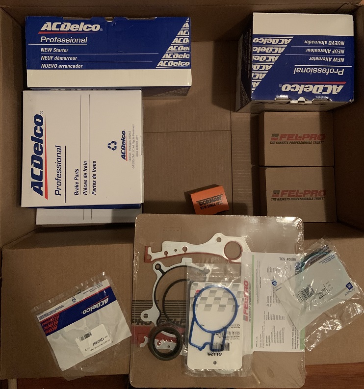 Ordered a lot of remaining things, all the gaskets and seals and whatnot, piston rings, a new Uplander engine mount (which is the same as a 3800 mount), 88 Fiero flywheel, all the parking brake cables, the newer model starter motor, and an alternator from a 99 Chevy Astro 4.3.