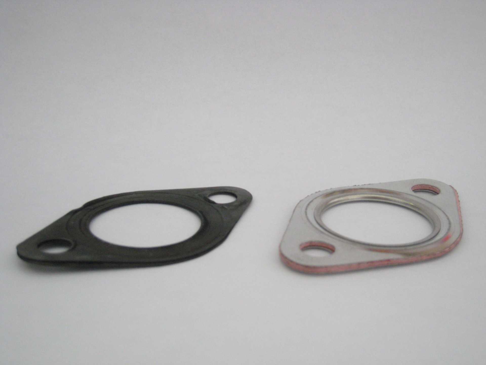 Right side of photo: New gasket (IAP 111251261B). Sandwich made of two metal layers with pink fibers in between. A fire ring prevents the exhaust gas from directly touching the fibers. Left side of photo: #5 gasket, completely flattened. The fibers are gone. I believe that the fibers burned away in the car.