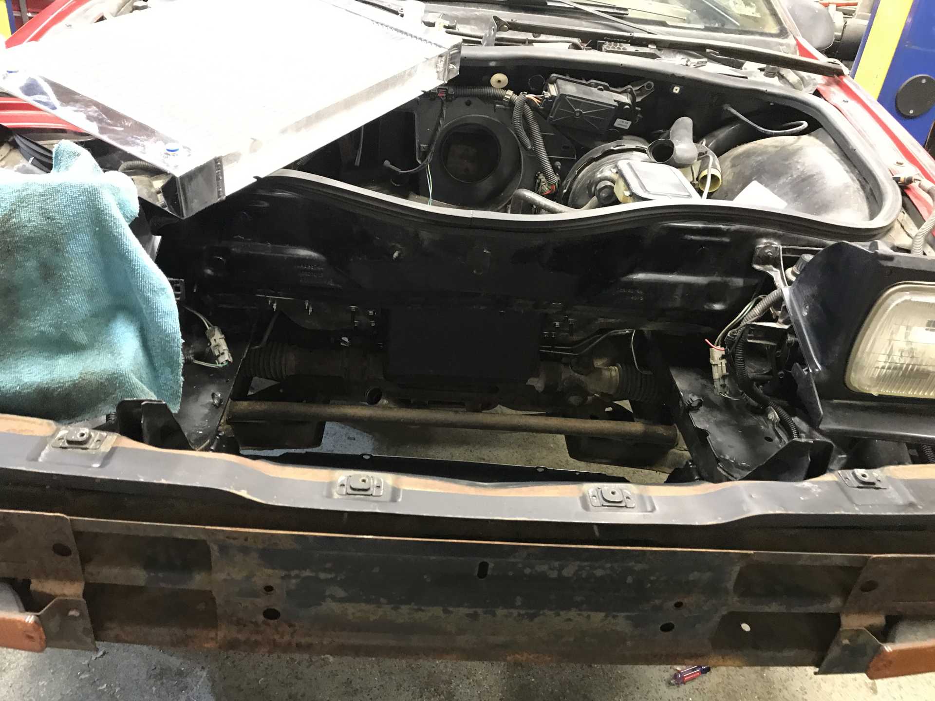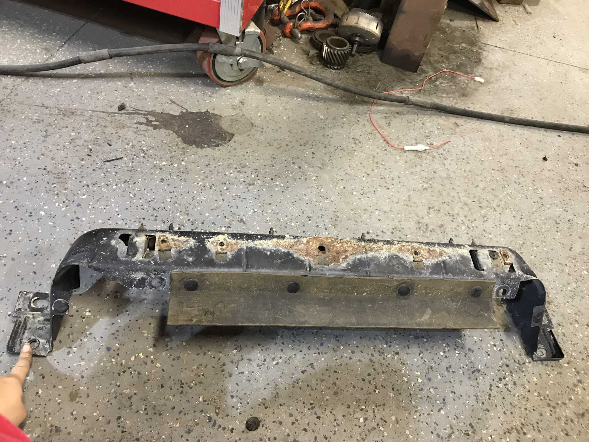 My dad and I kinda forgot the hood is connected to the top radiator bracket. The POs only had two bolts on their custom bracket, and since we were not thinking about it, the hood fell off and trashed the lift lever bracket. Oh well, at least that was the only damage. With the hood off, I could access the front well. Only minor surface rust, but might as well prep the area for a light spray of paint for now.