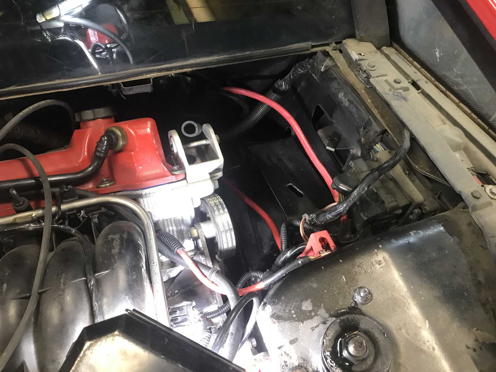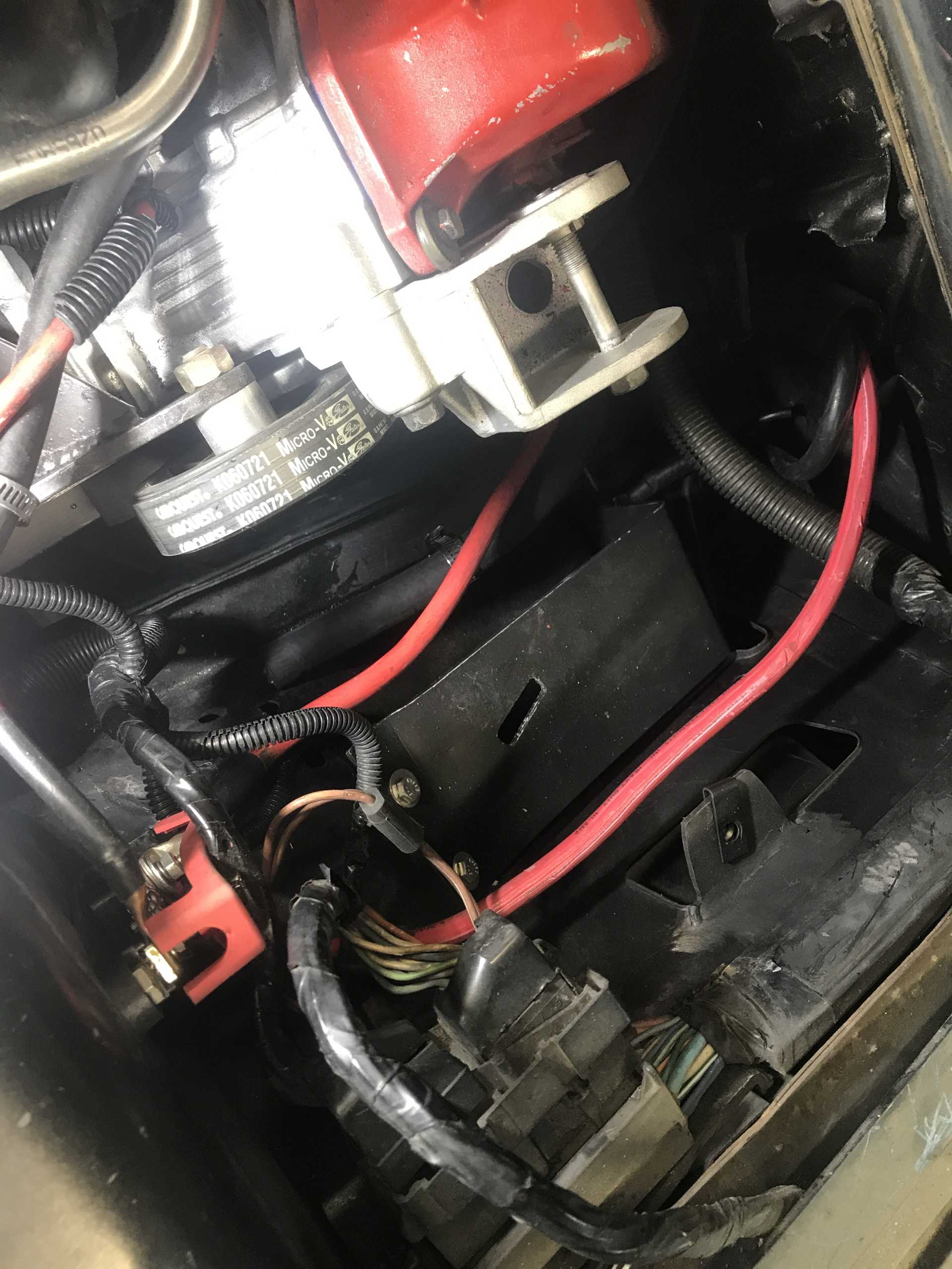 The main positive runs behind the expansion tank to the junction block. The closer red cable is from the alternator to the junction block.