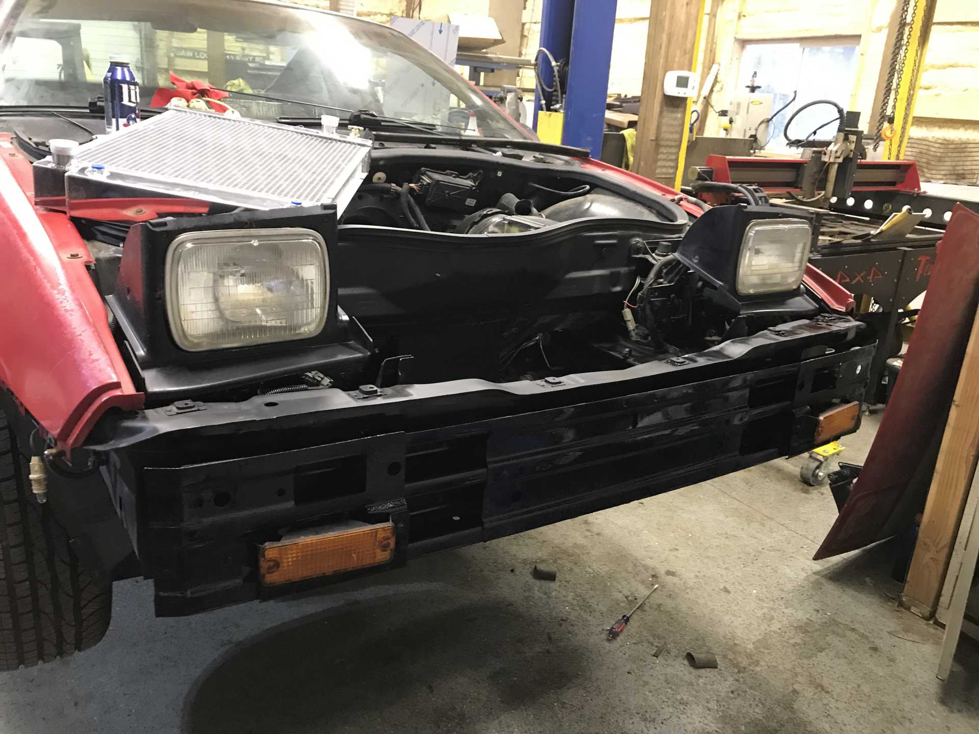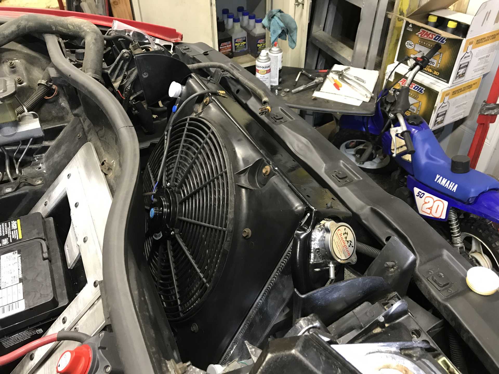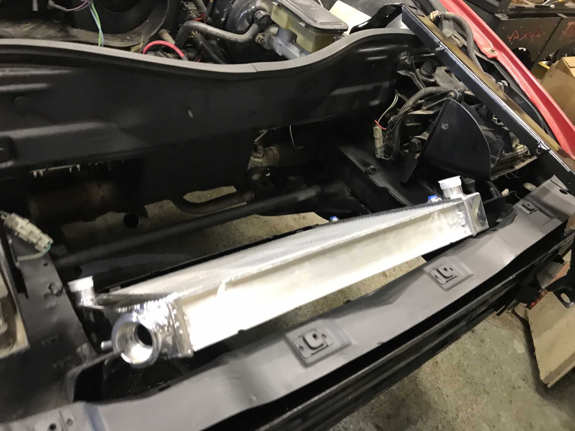 All installed! My dad and I worked on this all day and got a lot done. The old radiator had a different outlet for the lower tube, so I need to buy a new lower hose then it can be filled with coolant. Also, the fan plug doesn’t match the Fiero one so I ordered a new pair of water proof connectors.