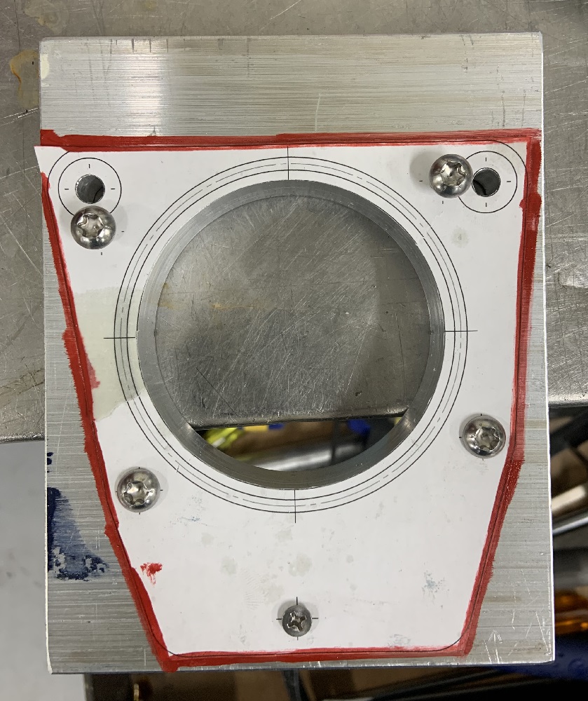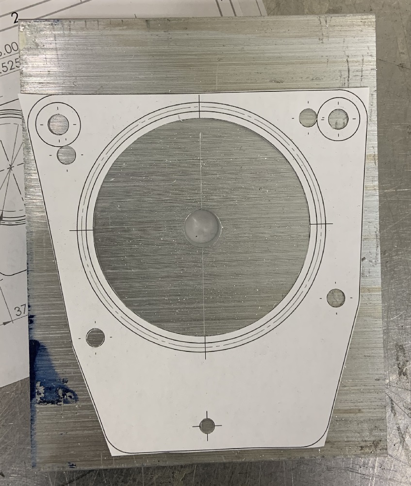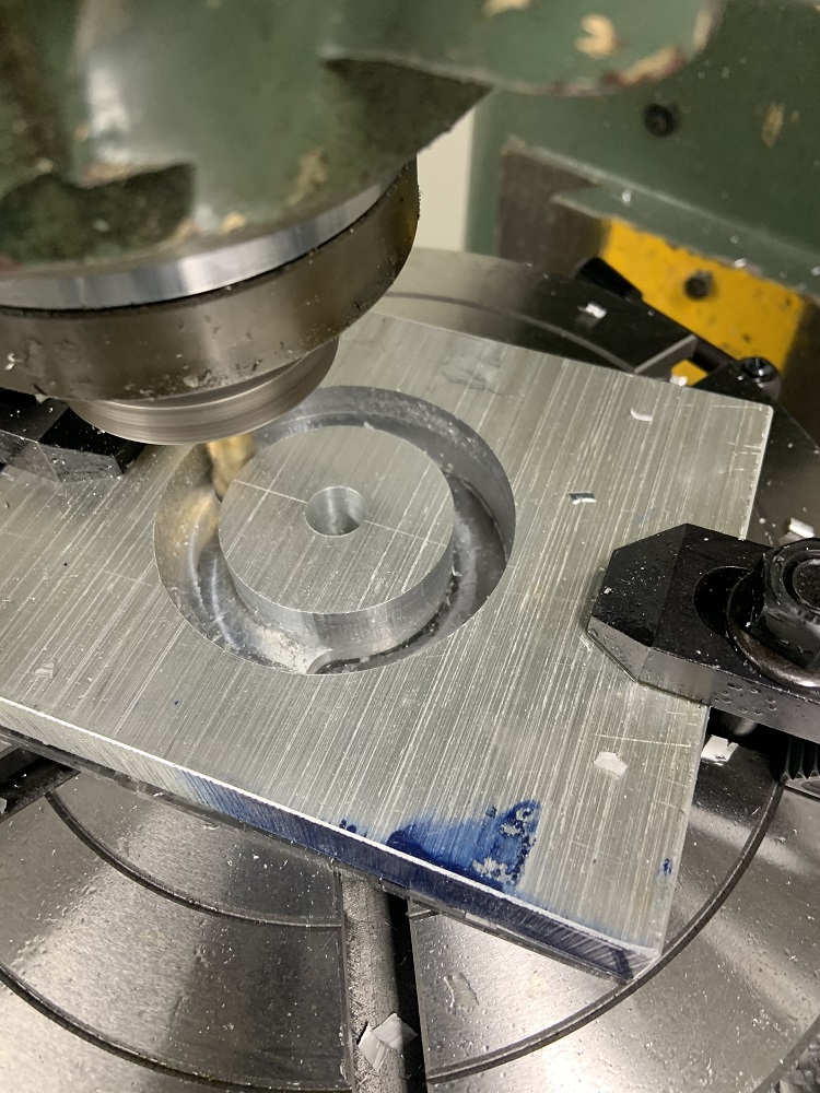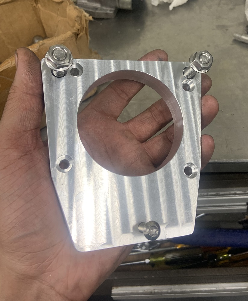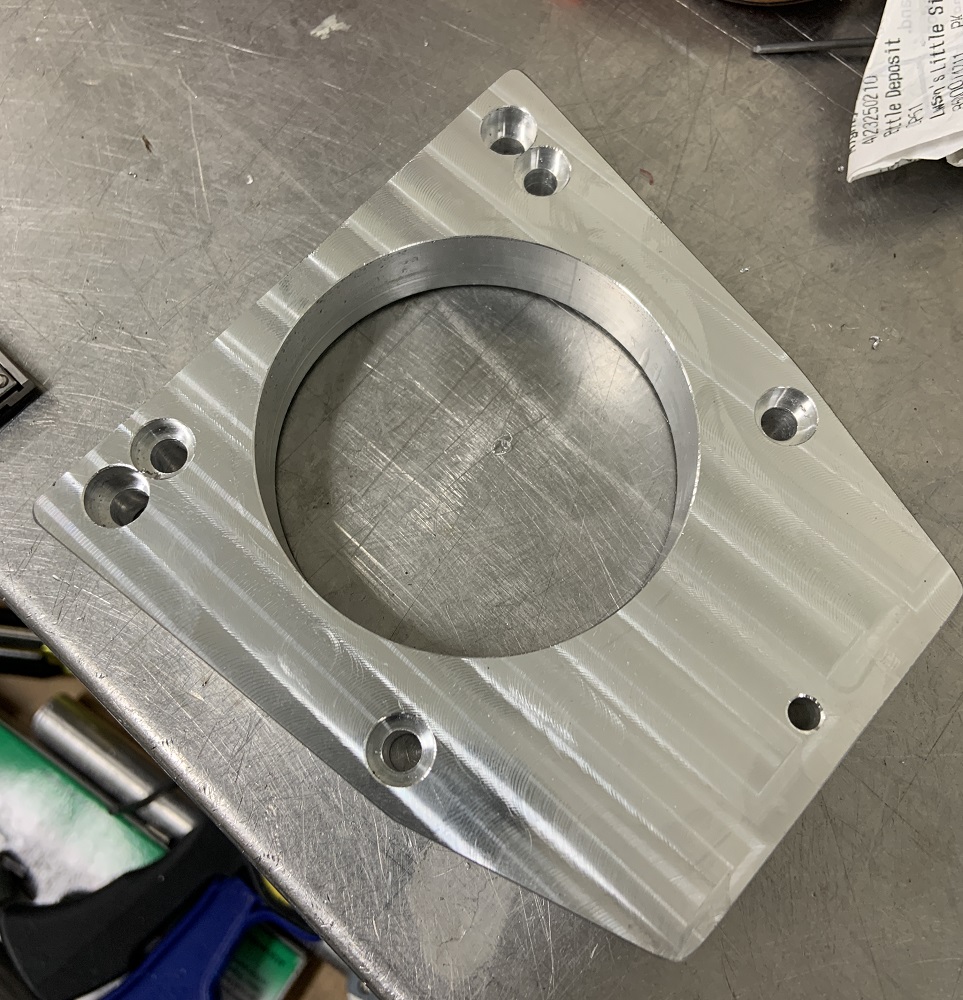 I also got a chance to get the throttle body adapter machined. First I cut a rough rectangle out, cleaned it up on the mill, and drilled a hole through the center where it lined up on the template so I could center it regardless of which side I was machining.