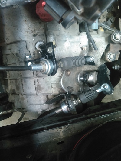 I kept the Rodney Dickman 5-speed cables that I've been using, good quality with steel ends, and modified the up-down/gate part like many others by cutting off one end and welding a tab on the other side to reverse the motion. On the fore-aft, I removed the F23 linkage assembly, drove out the pin and had a closer look. The stock arm with the weights has a rubber sleeve between it and the shifter shaft. I cut off the weights and used just the centre part of the arm. I made a steel sleeve that fits inside the centre and over the shaft with material sticking out below the centre, then cut a U-shaped arm to go around the shifter strut and welded that to the sleeve. That allowed the cable to attach about 90 degrees from the stock F23 orientation, allowing the stock cable to be used instead of the extra long custom cable that others use.